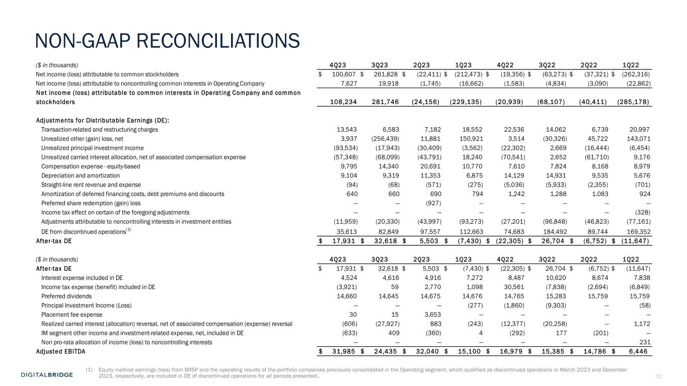 31 NON-GAAP RECONCILIATIONS ($ in thousands) 4Q23 3Q23 2Q23 1Q23 4Q22 3Q22 2Q22 1Q22 Net income (loss) attributable to common stockholders $ 100,607 $ 261,828 $ (22,411) $ (212,473) $ (19,356) $ (63,273) $ (37,321) $ (262,316) Net income (loss) attributable to noncontrolling common interests in Operating Company 7,627 19,918 (1,745) (16,662) (1,583) (4,834) (3,090) (22,862) Net income ( loss) attributable to common interests in Operating Company and common stockholders 108,234 281,746 (24,156) (229,135) (20,939) (68,107) (40,411) (285,178) Adjustments for Distributable Earnings (DE): Transaction-related and restructuring charges 13,543 6,583 7,182 18,552 22,536 14,062 6,739 20,997 Unrealized other (gain) loss, net 3,937 (256,439) 11,881 150,921 3,514 (30,326) 45,722 143,071 Unrealized principal investment income (93,534) (17,943) (30,409) (3,562) (22,302) 2,669 (16,444) (6,454) Unrealized carried interest allocation, net of associated compensation expense (57,348) (68,099) (43,791) 18,240 (70,541) 2,652 (61,710) 9,176 Compensation expense - equity-based 9,795 14,340 20,691 10,770 7,610 7,824 8,168 8,979 Depreciation and amortization 9,104 9,319 11,353 6,875 14,129 14,931 9,535 5,676 Straight-line rent revenue and expense (94) (68) (571) (275) (5,036) (5,933) (2,355) (701) Amortization of deferred financing costs, debt premiums and discounts 640 660 690 794 1,242 1,288 1,083 924 Preferred share redemption (gain) loss — — (927) — — — — — Income tax effect on certain of the foregoing adjustments — — — — — — — (328) Adjustments attributable to noncontrolling interests in investment entities (11,959) (20,330) (43,997) (93,273) (27,201) (96,848) (46,823) (77,161) DE from discontinued operations(1) 35,613 82,849 97,557 112,663 74,683 184,492 89,744 169,352 After-tax DE $ 17,931 $ 32,618 $ 5 ,503 $ (7 ,430) $ (22,305) $ 26,704 $ (6 ,752) $ (11,647) ($ in thousands) 4Q23 3Q23 2Q23 1Q23 4Q22 3Q22 2Q22 1Q22 After-tax DE $ 17,931 $ 32,618 $ 5,503 $ (7,430) $ (22,305) $ 26,704 $ (6,752) $ (11,647) Interest expense included in DE 4,524 4,616 4,916 7,272 8,487 10,620 8,674 7,838 Income tax expense (benefit) included in DE (3,921) 59 2,770 1,098 30,561 (7,838) (2,694) (6,849) Preferred dividends 14,660 14,645 14,675 14,676 14,765 15,283 15,759 15,759 Principal Investment Income (Loss) — — — (277) (1,860) (9,303) — (58) Placement fee expense 30 15 3,653 — — — — — Realized carried interest (allocation) reversal, net of associated compensation (expense) reversal (606) (27,927) 883 (243) (12,377) (20,258) — 1,172 IM segment other income and investment-related expense, net, included in DE (633) 409 (360) 4 (292) 177 (201) — Non pro-rata allocation of income (loss) to noncontrolling interests — — — — — — — 231 Adjusted EBITDA $ 31,985 $ 24,435 $ 32,040 $ 15,100 $ 16,979 $ 15,385 $ 14,786 $ 6 ,446 (1) Equity method earnings (loss) from BRSP and the operating results of the portfolio companies previously consolidated in the Operating segment, which qualified as discontinued operations in March 2023 and December 2023, respectively, are included in DE of discontinued operations for all periods presented..