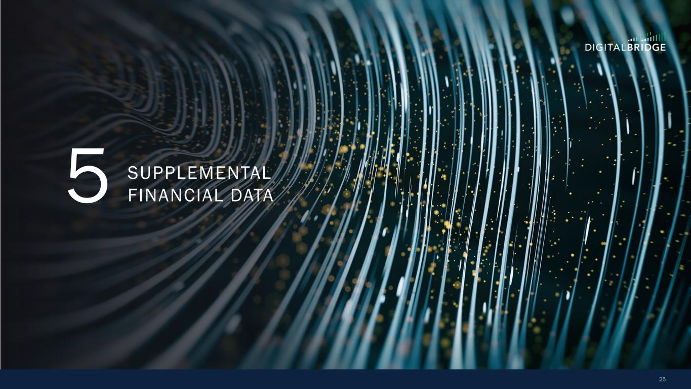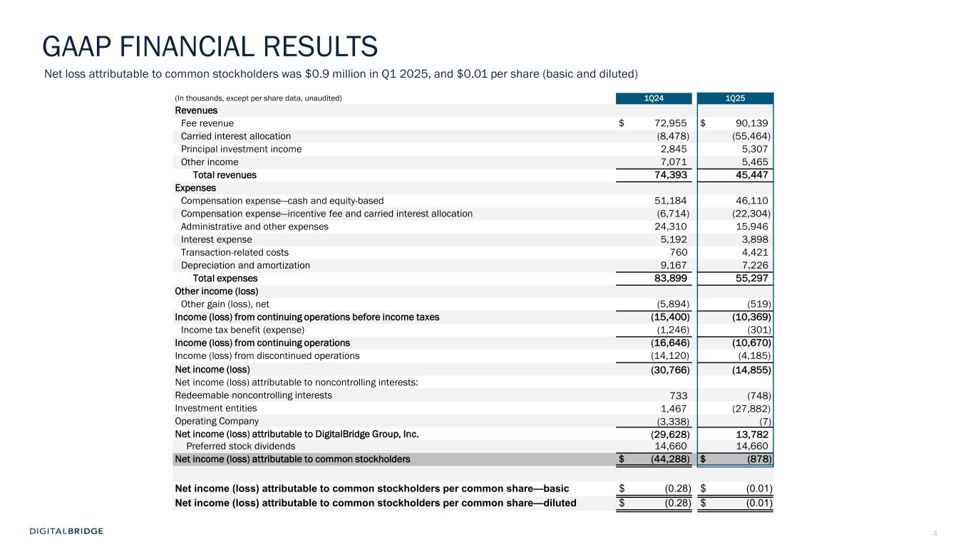 4 (In thousands, except per share data, unaudited) 1Q24 1Q25 Revenues Fee revenue $ 72,955 $ 90,139 Carried interest allocation (8,478) (55,464) Principal investment income 2,845 5,307 Other income 7,071 5,465 Total revenues 74,393 45,447 Expenses Compensation expense—cash and equity-based 51,184 46,110 Compensation expense—incentive fee and carried interest allocation (6,714) (22,304) Administrative and other expenses 24,310 15,946 Interest expense 5,192 3,898 Transaction-related costs 760 4,421 Depreciation and amortization 9,167 7,226 Total expenses 83,899 55,297 Other income (loss) Other gain (loss), net (5,894) (519) Income (loss) from continuing operations before income taxes (15,400) (10,369) Income tax benefit (expense) (1,246) (301) Income (loss) from continuing operations (16,646) (10,670) Income (loss) from discontinued operations (14,120) (4,185) Net income (loss) (30,766) (14,855) Net income (loss) attributable to noncontrolling interests: Redeemable noncontrolling interests 733 (748) Investment entities 1,467 (27,882) Operating Company (3,338) (7) Net income (loss) attributable to DigitalBridge Group, Inc. (29,628) 13,782 Preferred stock dividends 14,660 14,660 Net income (loss) attributable to common stockholders $ (44,288) $ (878) Net income (loss) attributable to common stockholders per common share—basic $ (0.28) $ (0.01) Net income (loss) attributable to common stockholders per common share—diluted $ (0.28) $ (0.01) GAAP FINANCIAL RESULTS Net loss attributable to common stockholders was $0.9 million in Q1 2025, and $0.01 per share (basic and diluted)