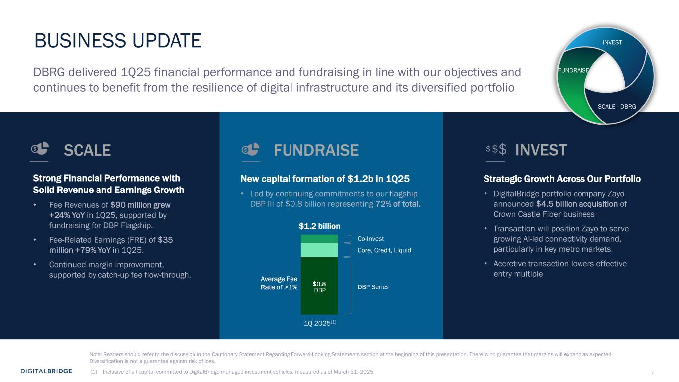 3 DBRG REPORTS FIRST QUARTER 2025 RESULTS Boca Raton, May 1st, 2025 - DigitalBridge Group, Inc. (NYSE: DBRG) and subsidiaries (collectively, “DigitalBridge,” or the “Company”) today announced financial results for the first quarter ended March 31, 2025. The Company reported first quarter 2025 total revenues of $45 million, GAAP net loss attributable to common stockholders of $1 million, or $0.01 per share, and Distributable Earnings of $55 million, or $0.29 per share. Common and Preferred Dividends On April 25, 2025, the Company’s Board of Directors declared a cash dividend of $0.01 per common share to be paid on July 15, 2025 to shareholders of record at the close of business on June 30, 2025; and declared cash dividends with respect to each series of the Company’s cumulative redeemable perpetual preferred stock in accordance with the terms of such series, as follows: Series H preferred stock: $0.4453125 per share; Series I preferred stock: $0.446875 per share; and Series J preferred stock: $0.4453125 per share, which will be paid on July 15, 2025 to the respective stockholders of record on July 10, 2025. First Quarter 2025 Conference Call The Company will conduct an earnings conference call and presentation to discuss the first quarter 2025 financial results on Thursday, May 1, 2025, at 8:00 a.m. Eastern Time (ET). The earnings presentation will be broadcast live over the Internet and a webcast link can be accessed on the Shareholders section of the Company’s website at ir.digitalbridge.com/events. To participate in the event by telephone, please dial (877) 407-4018 ten minutes prior to the start time (to allow time for registration). International callers should dial (201) 689-8471. For those unable to participate during the live call, a replay will be available starting May 1, 2025, at 12:00 p.m. ET. To access the replay, dial (844) 512-2921 (U.S.), and use conference ID 13751121. International callers should dial (412) 317-6671 and enter the same conference ID number. We’re pleased with the strong financial performance and fundraising we delivered in the first quarter. These results are consistent with our objectives for 2025 as well as our long-term goals to drive persistent double-digit revenue growth and expanding margins. We believe digital infrastructure is one of the most resilient, durable asset classes, positioning our portfolio to perform through market cycles, underpinned by the secular demand for ‘more, better, faster’ compute and connectivity. Marc Ganzi Chief Executive Officer “ ”
