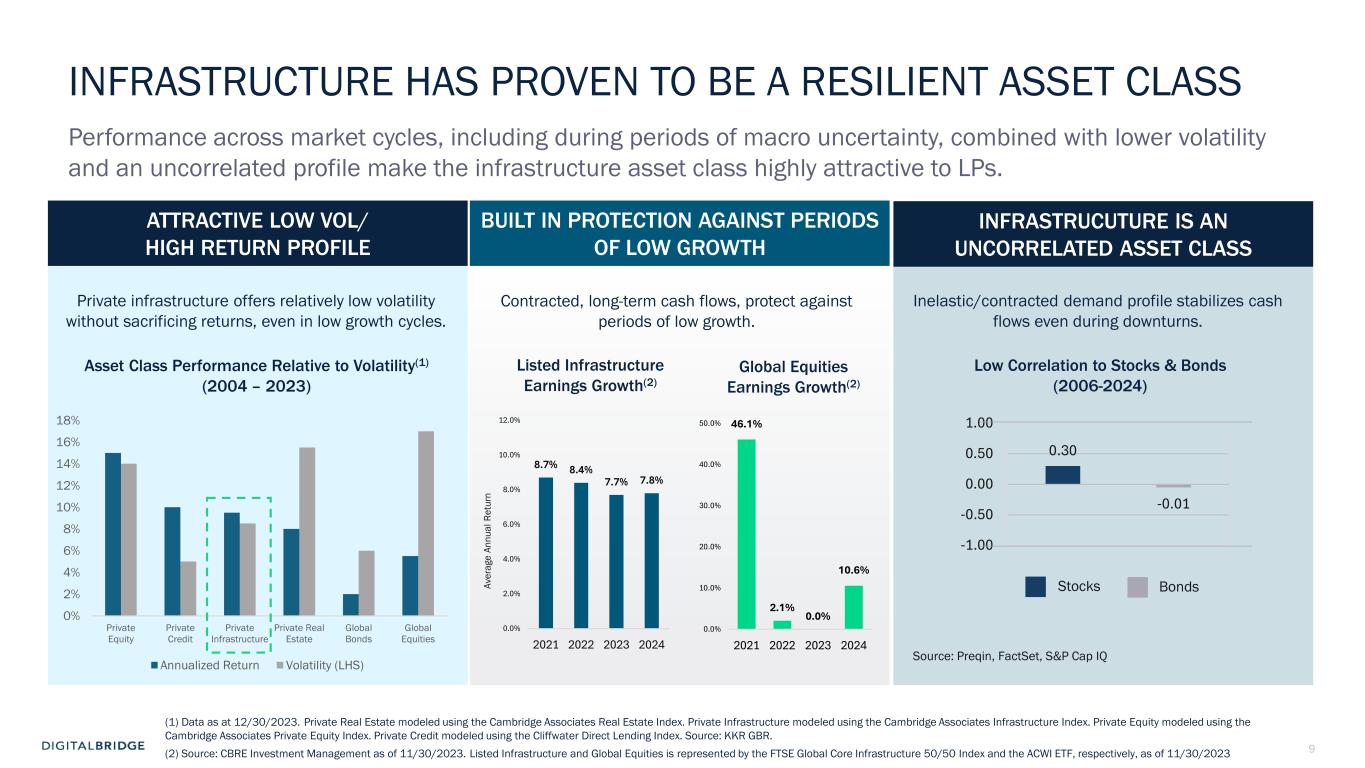 8 LONG-TERM DBRG OUTLOOK ON CURRENT MACRO ENVIRONMENT SHORT-TERM IMPACT Current macro conditions have both short- and long-term implications, while also bringing into focus the resilience and durability of the DBRG business model and digital infrastructure sector TRADE POLICY/ TARIFFS FINANCIAL MARKET VOLATILITY  Impact on Investment Decisions  Supply Chain  M&A Activity  Access to Capital Markets  Customers pause to assess impacts  Supply chain – DC build cost potentially +3-7% (assuming 10-20% tariffs) PORTCO New Businesses / CAPEX DBRG FUNDRAISING  LP decision making delays  De-minimus, activity subject to steady, long-term contracts  Infrastructure is inflation- protected asset class Existing Businesses PORTCO DBRG FUNDRAISING  Ability to highlight asset class resilience, attracts capital through cycles  Durable DBRG business model…. We believe will generate YoY earnings growth even in fully de-risked scenario  Long duration contracts protect businesses...this is why investors like digital infra  Secular demand…Need for more compute and connectivity  Digital services not a ‘trade deficit issue’ like imported goods  DBRG portcos have opportunity to differentiate and highlight benefits of scale + experience  Similar challenges have been addressed before in covid, financial crisis, etc. New Businesses / CAPEX Existing Businesses