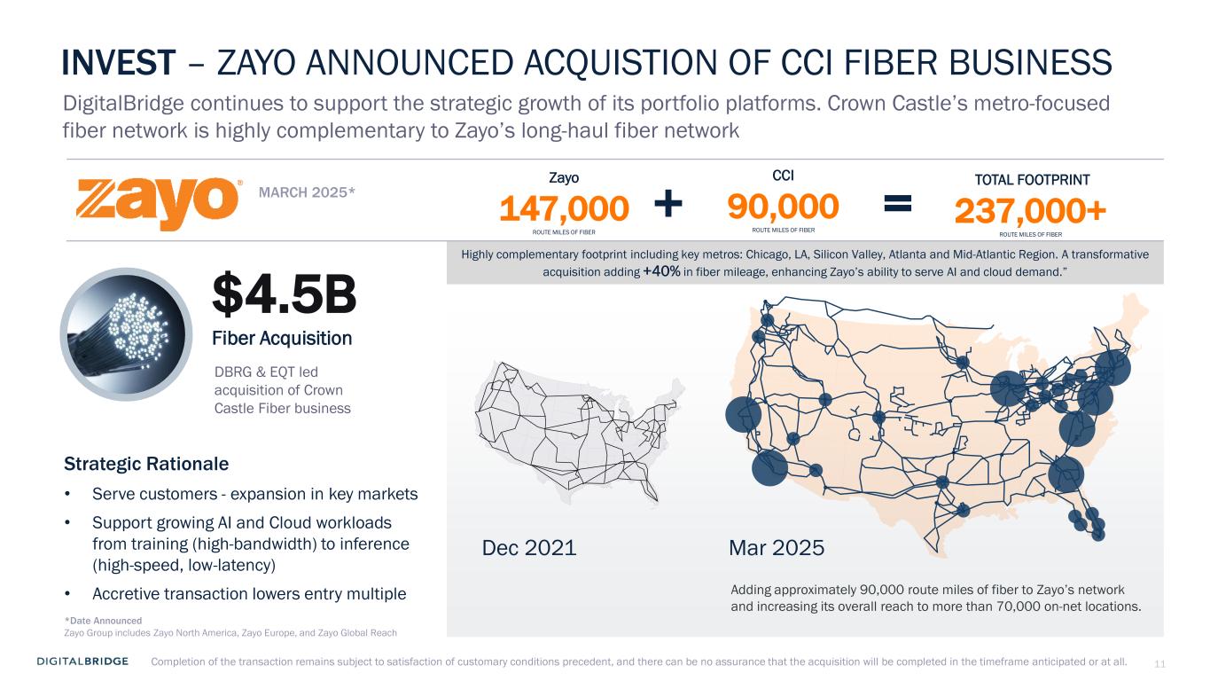 11 INVEST – ZAYO ANNOUNCED ACQUISTION OF CCI FIBER BUSINESS DigitalBridge continues to support the strategic growth of its portfolio platforms. Crown Castle’s metro-focused fiber network is highly complementary to Zayo’s long-haul fiber network Dec 2021 Mar 2025 DBRG & EQT led acquisition of Crown Castle Fiber business MARCH 2025* $4.5B Fiber Acquisition Strategic Rationale • Serve customers - expansion in key markets • Support growing AI and Cloud workloads from training (high-bandwidth) to inference (high-speed, low-latency) • Accretive transaction lowers entry multiple Highly complementary footprint including key metros: Chicago, LA, Silicon Valley, Atlanta and Mid-Atlantic Region. A transformative acquisition adding +40% in fiber mileage, enhancing Zayo’s ability to serve AI and cloud demand.” Adding approximately 90,000 route miles of fiber to Zayo’s network and increasing its overall reach to more than 70,000 on-net locations. Zayo 147,000 ROUTE MILES OF FIBER CCI 90,000 ROUTE MILES OF FIBER TOTAL FOOTPRINT 237,000+ ROUTE MILES OF FIBER *Date Announced Zayo Group includes Zayo North America, Zayo Europe, and Zayo Global Reach Completion of the transaction remains subject to satisfaction of customary conditions precedent, and there can be no assurance that the acquisition will be completed in the timeframe anticipated or at all.