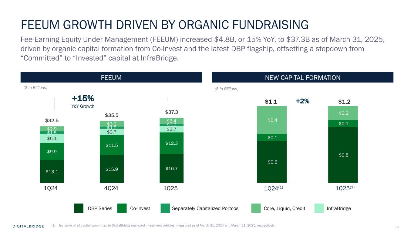 13 FIRST QUARTER 2025 HIGHLIGHTS Financial Highlights  Fee Revenue  $90.2 million in 1Q25, up 24% year-over-year (including $12.0 million of catch-up fees).  Driven primarily by new capital formation in our DBP series of funds.  Fee Related Earnings  $35.0 million in 1Q25, up 79% year-over-year, consistent with our 2025 guidance.  Distributable Earnings  $54.7 million in 1Q25, up $52.5 million year-over-year, due to 1Q25 DataBank principal investment realization. Capital Metrics  Fee Earning Equity Under Management (FEEUM)  $37.3 billion, up 15% year-over-year, increased $4.8 billion year-over-year and $1.8 billion over prior quarter.  New Capital Formation  $1.2 billion during 1Q25  Driven by commitments to the latest DBP series, co-investments, and credit strategy. Corporate  Liquidity  $201 million of available corporate cash as of March 31, 2025.  Full availability of $300 million revolver.  Capital Allocation  Funded $9.0 million of GP commitments in 1Q25.  Common stock dividend of $0.01 per share declared for the quarter. Unless otherwise denoted as GAAP financial results, reference to Fee Revenue throughout this presentation refers to FRE Fee Revenue.