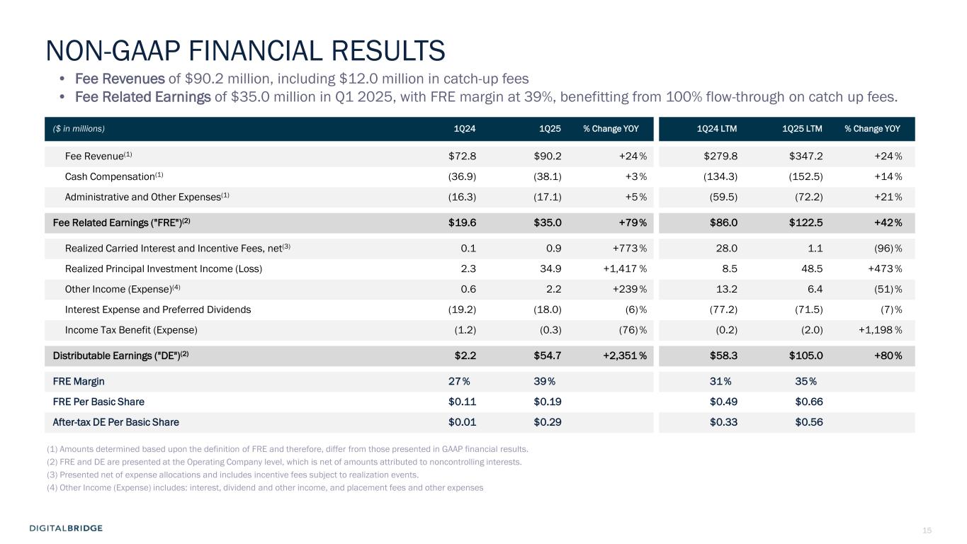 14 $0.6 $0.8 $0.1 $0.1 $0.4 $0.2 FEEUM GROWTH DRIVEN BY ORGANIC FUNDRAISING Fee-Earning Equity Under Management (FEEUM) increased $4.8B, or 15% YoY, to $37.3B as of March 31, 2025, driven by organic capital formation from Co-Invest and the latest DBP flagship, offsetting a stepdown from “Committed” to “Invested” capital at InfraBridge. DBP Series Co-Invest Separately Capitalized Portcos Core, Liquid, Credit NEW CAPITAL FORMATIONFEEUM InfraBridge +15% YoY Growth ($ in Billions) ($ in Billions) (1) Inclusive of all capital committed to DigitalBridge managed investment vehicles, measured as of March 31, 2024 and March 31, 2025, respectively. 1Q25(1) $1.2 1Q24(1) $1.1 +2% 4Q24 1Q251Q24 $13.1 $15.9 $16.7 $9.9 $11.5 $12.3 $5.1 $3.7 $3.7 $1.5 $1.2 $1.2 $2.9 $3.2 $3.4 $32.5 $35.5 $37.3