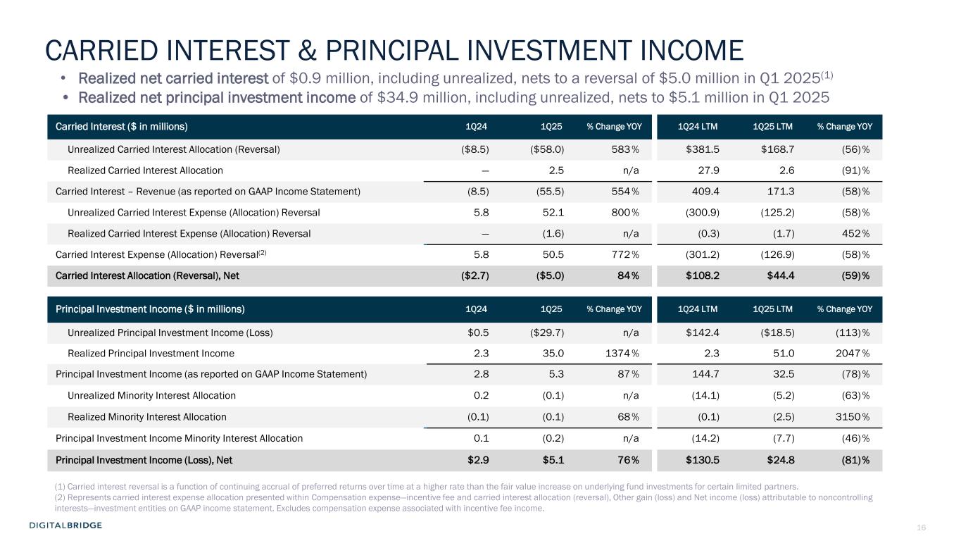15 NON-GAAP FINANCIAL RESULTS ($ in millions) 1Q24 1Q25 % Change YOY 1Q24 LTM 1Q25 LTM % Change YOY Fee Revenue(1) $72.8 $90.2 +24 % $279.8 $347.2 +24 % Cash Compensation(1) (36.9) (38.1) +3 % (134.3) (152.5) +14 % Administrative and Other Expenses(1) (16.3) (17.1) +5 % (59.5) (72.2) +21 % Fee Related Earnings ("FRE")(2) $19.6 $35.0 +79% $86.0 $122.5 +42% Realized Carried Interest and Incentive Fees, net(3) 0.1 0.9 +773 % 28.0 1.1 (96) % Realized Principal Investment Income (Loss) 2.3 34.9 +1,417 % 8.5 48.5 +473 % Other Income (Expense)(4) 0.6 2.2 +239 % 13.2 6.4 (51) % Interest Expense and Preferred Dividends (19.2) (18.0) (6)% (77.2) (71.5) (7)% Income Tax Benefit (Expense) (1.2) (0.3) (76) % (0.2) (2.0) +1,198 % Distributable Earnings ("DE")(2) $2.2 $54.7 +2,351 % $58.3 $105.0 +80% FRE Margin 27% 39% 31% 35% FRE Per Basic Share $0.11 $0.19 $0.49 $0.66 After-tax DE Per Basic Share $0.01 $0.29 $0.33 $0.56 (1) Amounts determined based upon the definition of FRE and therefore, differ from those presented in GAAP financial results. (2) FRE and DE are presented at the Operating Company level, which is net of amounts attributed to noncontrolling interests. (3) Presented net of expense allocations and includes incentive fees subject to realization events. (4) Other Income (Expense) includes: interest, dividend and other income, and placement fees and other expenses • Fee Revenues of $90.2 million, including $12.0 million in catch-up fees • Fee Related Earnings of $35.0 million in Q1 2025, with FRE margin at 39%, benefitting from 100% flow-through on catch up fees.