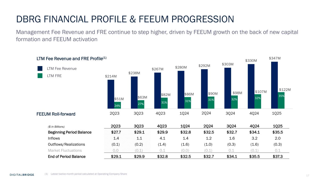 16 Carried Interest ($ in millions) 1Q24 1Q25 % Change YOY 1Q24 LTM 1Q25 LTM % Change YOY Unrealized Carried Interest Allocation (Reversal) ($8.5) ($58.0) 583 % $381.5 $168.7 (56) % Realized Carried Interest Allocation — 2.5 n/a 27.9 2.6 (91) % Carried Interest – Revenue (as reported on GAAP Income Statement) (8.5) (55.5) 554 % 409.4 171.3 (58) % Unrealized Carried Interest Expense (Allocation) Reversal 5.8 52.1 800 % (300.9) (125.2) (58) % Realized Carried Interest Expense (Allocation) Reversal — (1.6) n/a (0.3) (1.7) 452 % Carried Interest Expense (Allocation) Reversal(2) 5.8 50.5 772 % (301.2) (126.9) (58) % Carried Interest Allocation (Reversal), Net ($2.7) ($5.0) 84% $108.2 $44.4 (59)% Principal Investment Income ($ in millions) 1Q24 1Q25 % Change YOY 1Q24 LTM 1Q25 LTM % Change YOY Unrealized Principal Investment Income (Loss) $0.5 ($29.7) n/a $142.4 ($18.5) (113) % Realized Principal Investment Income 2.3 35.0 1374 % 2.3 51.0 2047 % Principal Investment Income (as reported on GAAP Income Statement) 2.8 5.3 87 % 144.7 32.5 (78) % Unrealized Minority Interest Allocation 0.2 (0.1) n/a (14.1) (5.2) (63) % Realized Minority Interest Allocation (0.1) (0.1) 68 % (0.1) (2.5) 3150 % Principal Investment Income Minority Interest Allocation 0.1 (0.2) n/a (14.2) (7.7) (46) % Principal Investment Income (Loss), Net $2.9 $5.1 76% $130.5 $24.8 (81)% (1) Carried interest reversal is a function of continuing accrual of preferred returns over time at a higher rate than the fair value increase on underlying fund investments for certain limited partners. (2) Represents carried interest expense allocation presented within Compensation expense—incentive fee and carried interest allocation (reversal), Other gain (loss) and Net income (loss) attributable to noncontrolling interests—investment entities on GAAP income statement. Excludes compensation expense associated with incentive fee income. CARRIED INTEREST & PRINCIPAL INVESTMENT INCOME • Realized net carried interest of $0.9 million, including unrealized, nets to a reversal of $5.0 million in Q1 2025(1) • Realized net principal investment income of $34.9 million, including unrealized, nets to $5.1 million in Q1 2025