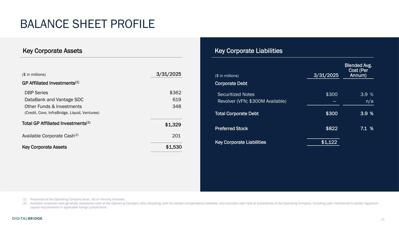 17 DBRG FINANCIAL PROFILE & FEEUM PROGRESSION Management Fee Revenue and FRE continue to step higher, driven by FEEUM growth on the back of new capital formation and FEEUM activation LTM Fee Revenue LTM FRE ($ in Billions) 2Q23 3Q23 4Q23 1Q24 2Q24 3Q24 4Q24 1Q25 Beginning Period Balance $27.7 $29.1 $29.9 $32.8 $32.5 $32.7 $34.1 $35.5 Inflows 1.4 1.1 4.1 1.4 1.2 1.6 3.2 2.0 Outflows/Realizations (0.1) (0.2) (1.4) (1.6) (1.0) (0.3) (1.6) (0.3) Market Fluctuations 0.0 (0.1) 0.1 (0.0) (0.1) 0.1 (0.1) 0.1 End of Period Balance $29.1 $29.9 $32.8 $32.5 $32.7 $34.1 $35.5 $37.3 LTM Fee Revenue and FRE Profile(1) FEEUM Roll-forward (1) Latest twelve-month period calculated at Operating Company Share $214M $238M $267M $280M $292M $303M $330M $347M $51M $63M $82M $86M $90M $98M $107M $122M 1Q254Q243Q242Q241Q244Q233Q23 35% 32%32%31%31%31%27%24% 2Q23