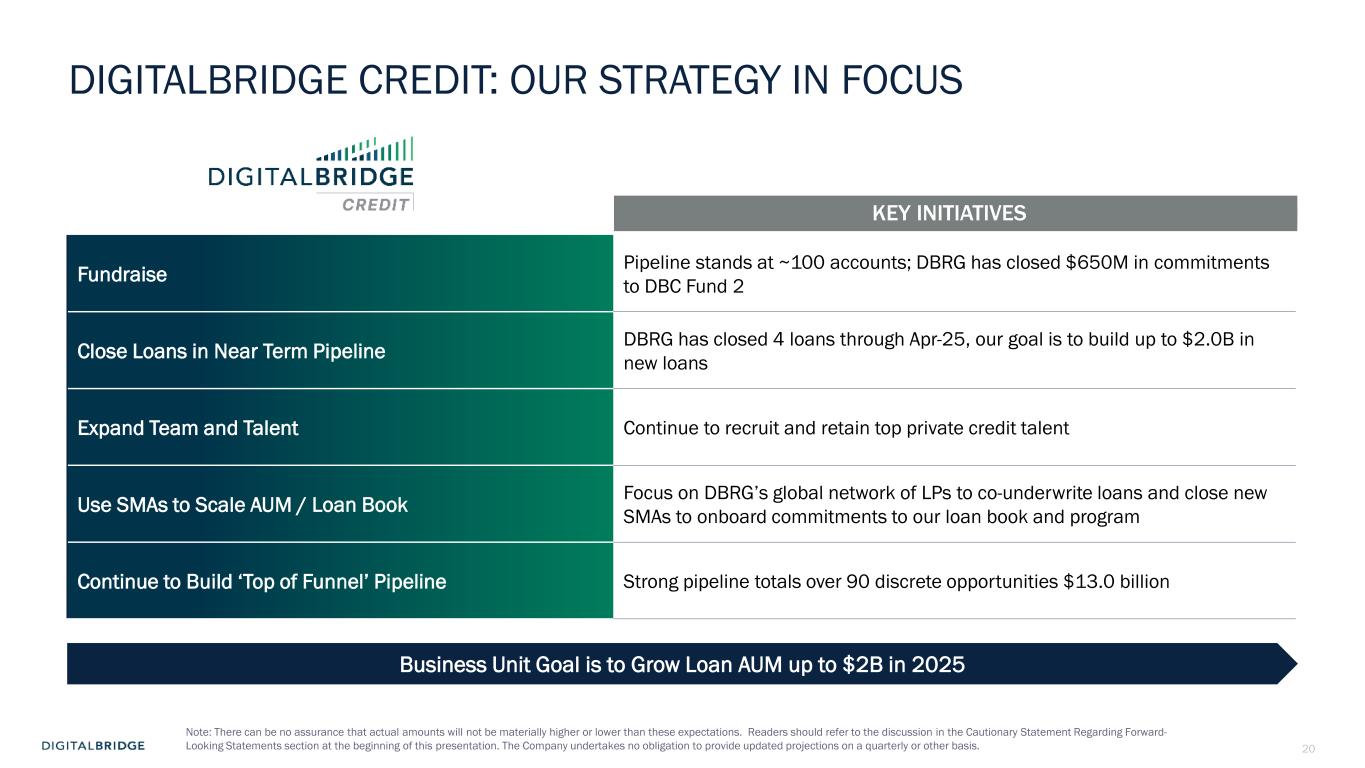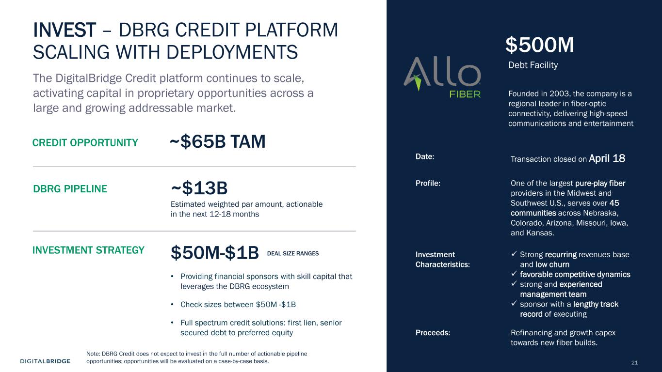 20 DIGITALBRIDGE CREDIT: OUR STRATEGY IN FOCUS Fundraise Pipeline stands at ~100 accounts; DBRG has closed $650M in commitments to DBC Fund 2 Close Loans in Near Term Pipeline DBRG has closed 4 loans through Apr-25, our goal is to build up to $2.0B in new loans Expand Team and Talent Continue to recruit and retain top private credit talent Use SMAs to Scale AUM / Loan Book Focus on DBRG’s global network of LPs to co-underwrite loans and close new SMAs to onboard commitments to our loan book and program Continue to Build ‘Top of Funnel’ Pipeline Strong pipeline totals over 90 discrete opportunities $13.0 billion KEY INITIATIVES Business Unit Goal is to Grow Loan AUM up to $2B in 2025 Note: There can be no assurance that actual amounts will not be materially higher or lower than these expectations. Readers should refer to the discussion in the Cautionary Statement Regarding Forward- Looking Statements section at the beginning of this presentation. The Company undertakes no obligation to provide updated projections on a quarterly or other basis.