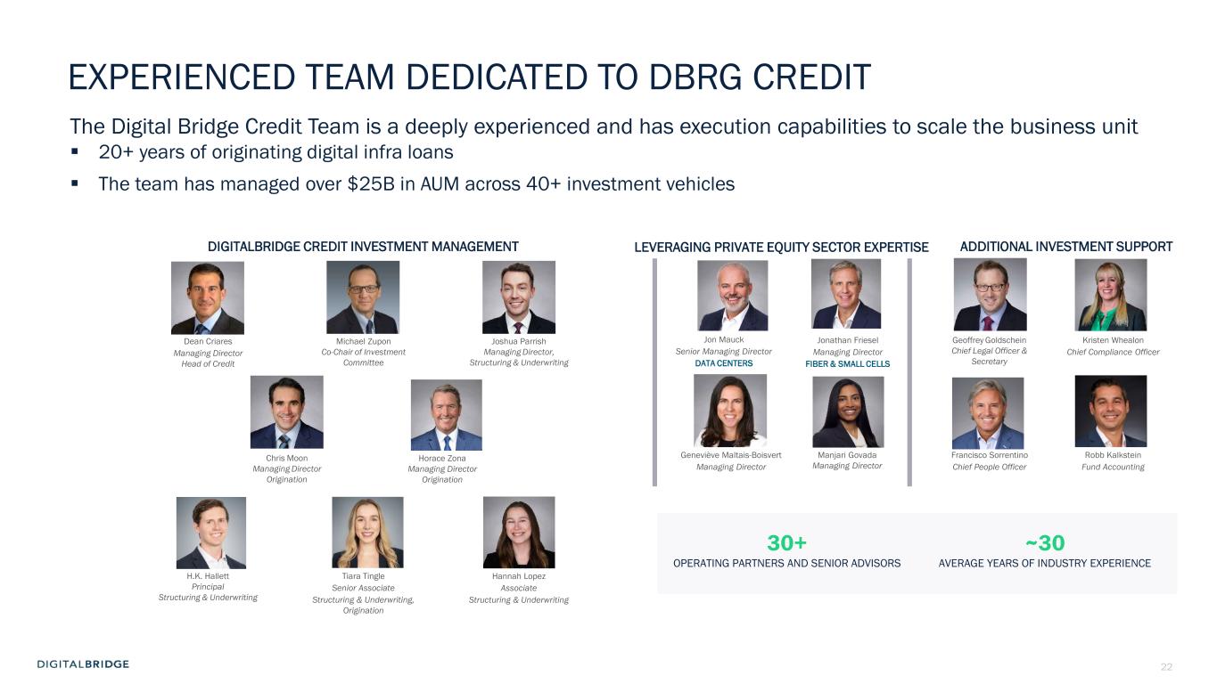 21 INVEST – DBRG CREDIT PLATFORM SCALING WITH DEPLOYMENTS DBRG PIPELINE The DigitalBridge Credit platform continues to scale, activating capital in proprietary opportunities across a large and growing addressable market. CREDIT OPPORTUNITY • Providing financial sponsors with skill capital that leverages the DBRG ecosystem • Check sizes between $50M -$1B • Full spectrum credit solutions: first lien, senior secured debt to preferred equity $50M-$1B DEAL SIZE RANGESINVESTMENT STRATEGY ~$65B TAM ~$13B Estimated weighted par amount, actionable in the next 12-18 months $500M Debt Facility Date: Transaction closed on April 18 Profile: One of the largest pure-play fiber providers in the Midwest and Southwest U.S., serves over 45 communities across Nebraska, Colorado, Arizona, Missouri, Iowa, and Kansas. Investment Characteristics:  Strong recurring revenues base and low churn  favorable competitive dynamics  strong and experienced management team  sponsor with a lengthy track record of executing Proceeds: Refinancing and growth capex towards new fiber builds. Founded in 2003, the company is a regional leader in fiber-optic connectivity, delivering high-speed communications and entertainment Note: DBRG Credit does not expect to invest in the full number of actionable pipeline opportunities; opportunities will be evaluated on a case-by-case basis.