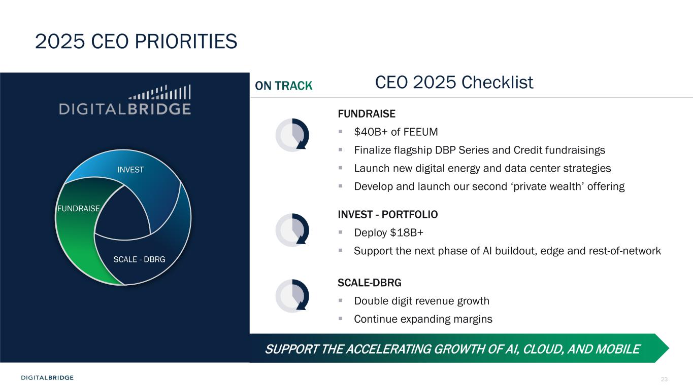 23 2025 CEO PRIORITIES CEO 2025 Checklist FUNDRAISE  $40B+ of FEEUM  Finalize flagship DBP Series and Credit fundraisings  Launch new digital energy and data center strategies  Develop and launch our second ‘private wealth’ offering INVEST - PORTFOLIO  Deploy $18B+  Support the next phase of AI buildout, edge and rest-of-network SCALE-DBRG  Double digit revenue growth  Continue expanding margins SUPPORT THE ACCELERATING GROWTH OF AI, CLOUD, AND MOBILE INVEST FUNDRAISE SCALE - DBRG