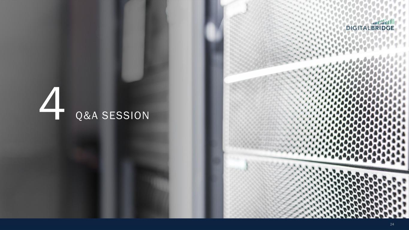 22 Robb Kalkstein Fund Accounting EXPERIENCED TEAM DEDICATED TO DBRG CREDIT DIGITALBRIDGE CREDIT INVESTMENT MANAGEMENT LEVERAGING PRIVATE EQUITY SECTOR EXPERTISE Geneviève Maltais-Boisvert Managing Director Manjari Govada Managing Director Jon Mauck Senior Managing Director DATA CENTERS ADDITIONAL INVESTMENT SUPPORT Kristen Whealon Chief Compliance Officer Jonathan Friesel Managing Director FIBER & SMALL CELLS Geoffrey Goldschein Chief Legal Officer & Secretary Dean Criares Managing Director Head of Credit Joshua Parrish Managing Director, Structuring & Underwriting H.K. Hallett Principal Structuring & Underwriting Michael Zupon Co-Chair of Investment Committee Chris Moon Managing Director Origination Francisco Sorrentino Chief People Officer Tiara Tingle Senior Associate Structuring & Underwriting, Origination Hannah Lopez Associate Structuring & Underwriting 30+ OPERATING PARTNERS AND SENIOR ADVISORS ~30 AVERAGE YEARS OF INDUSTRY EXPERIENCE Horace Zona Managing Director Origination The Digital Bridge Credit Team is a deeply experienced and has execution capabilities to scale the business unit  20+ years of originating digital infra loans  The team has managed over $25B in AUM across 40+ investment vehicles