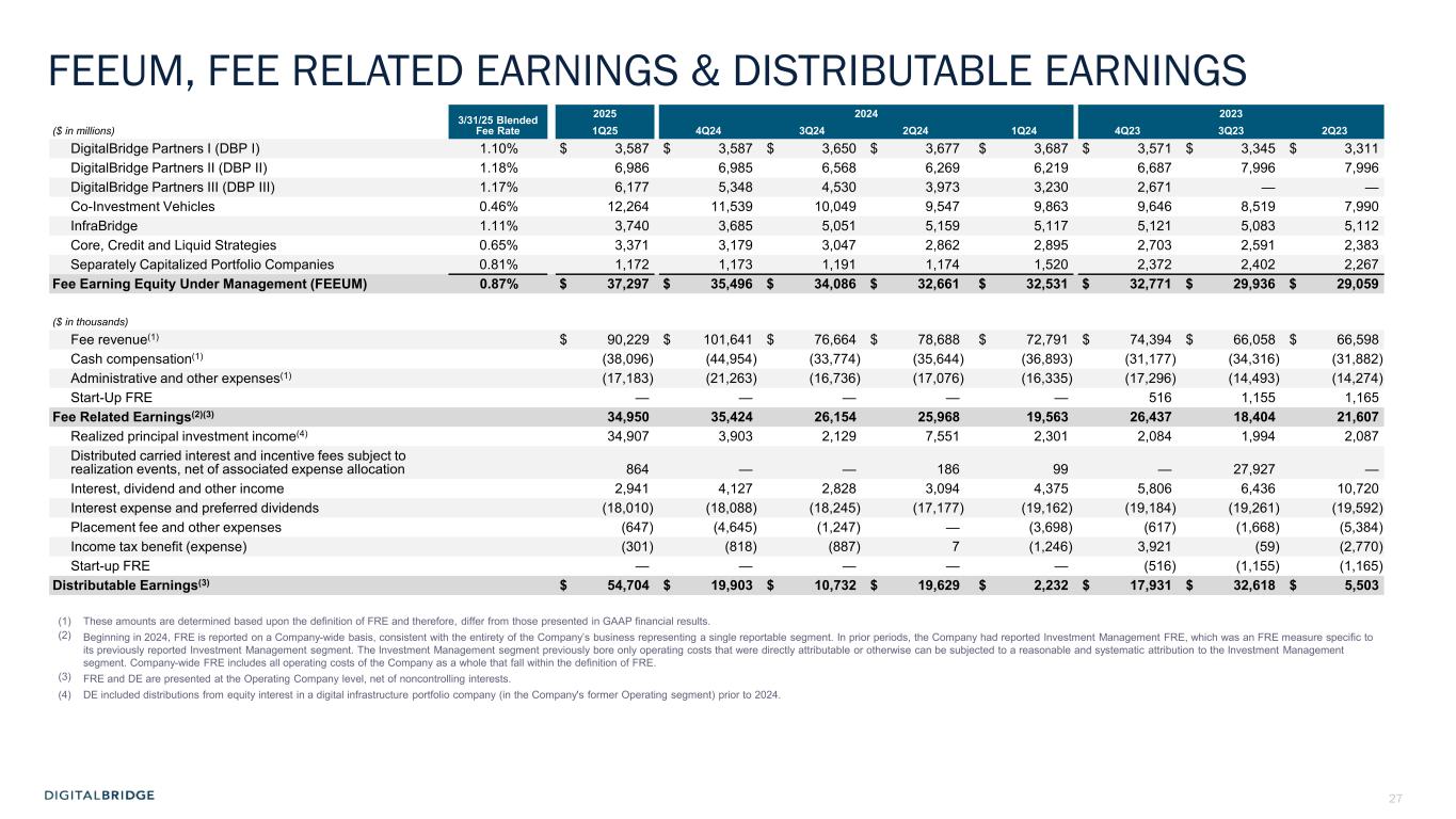26 SUMMARY FINANCIAL METRICS 2025 2024 2023 ($ and shares in thousands, except per share data and as noted) 1Q25 4Q24 3Q24 2Q24 1Q24 4Q23 3Q23 2Q23 GAAP Results GAAP Fee revenue $ 90,139 $ 101,551 $ 76,582 $ 78,605 $ 72,955 $ 74,009 $ 65,240 $ 65,742 Net income (loss) attributable to common stockholders (878) (19,711) (883) 76,763 (44,288) 100,607 261,828 (22,411) Net income (loss) attributable to common stockholders per basic share(1) (0.01) (0.12) (0.01) 0.44 (0.28) 0.61 1.60 (0.14) Common dividend per share 0.01 0.01 0.01 0.01 0.01 0.01 0.01 0.01 Non-GAAP Results Fee Related Earnings ("FRE") Fee Revenue(2) $ 90,229 $ 101,641 $ 76,664 $ 78,688 $ 72,791 $ 74,394 $ 66,058 $ 66,598 Fee Related Earnings(3) 34,950 35,424 26,154 25,968 19,563 26,437 18,404 21,607 FRE per basic share 0.19 0.19 0.14 0.14 0.11 0.15 0.10 0.12 Distributable Earnings ("DE")(3) 54,704 19,903 10,732 19,629 2,232 17,931 32,618 5,503 DE per basic share 0.29 0.11 0.06 0.11 0.01 0.10 0.19 0.03 Fee Earning Equity Under Management ("FEEUM") (in billions) $ 37.3 $ 35.5 $ 34.1 $ 32.7 $ 32.5 $ 32.8 $ 29.9 $ 29.1 Balance Sheet and Capitalization Total assets $ 3,439,028 $ 3,513,318 $ 3,542,947 $ 3,502,420 $ 3,463,816 $ 3,562,550 $ 6,872,091 $ 10,757,065 Total debt principal(4) 300,000 300,000 300,000 300,000 372,422 378,422 383,082 404,222 Available corporate cash 201,310 139,950 126,760 127,260 112,948 175,195 230,300 204,508 Perpetual Preferred Equity, $25 per share liquidation preference 821,899 821,899 821,899 821,899 821,899 821,899 821,899 821,899 Share Count FRE and DE weighted average basic shares and OP units(5) 186,887 186,488 186,906 185,916 176,222 175,946 175,874 173,636 Diluted shares and OP units outstanding at period end(5) 188,594 186,979 188,040 187,218 187,998 186,406 185,943 185,506 (1) For purpose of calculating net income (loss) attributable to common stockholders per basic share, net income (loss) attributable to common stockholders is adjusted to deduct dividends attributed to unvested restricted stock and deferred stock units and divided by GAAP weighted average basic shares, which represent the weighted average number of class A and class B common stock outstanding during the respective quarters. (2) FRE fee revenue represents recurring fee revenue, including incentive fees, that are not subject to realization events related to underlying fund investments, and does not give effect to elimination of fee revenue from consolidated funds. (3) FRE and DE are presented at the Operating Company level, net of noncontrolling interests. (4) For all periods presented, total debt principal excludes $300 million of undrawn VFN borrowing availability. (5) FRE and DE weighted average basic shares and OP units are used to calculate FRE per basic share and DE per basic share, representing the GAAP weighted average basic shares outstanding, plus weighted average unvested restricted stock and OP units outstanding during the respective quarters. Diluted shares and OP units outstanding at period end represent the same shares and units outstanding at respective quarter ends (not a weighted average), adjusted to include the effect of potentially dilutive share equivalents which are common stock issuable in connection with performance stock units, in-the-money warrants and, prior to their exchange/redemption in Q2 2024, exchangeable senior notes.
