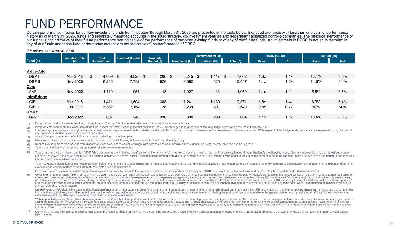 28 Certain performance metrics for our key investment funds from inception through March 31, 2025 are presented in the table below. Excluded are funds with less than one year of performance history as of March 31, 2025, funds and separately managed accounts in the liquid strategy, co-investment vehicles and separately capitalized portfolio companies. The historical performance of our funds is not indicative of their future performance nor indicative of the performance of our other existing funds or of any of our future funds. An investment in DBRG is not an investment in any of our funds and these fund performance metrics are not indicative of the performance of DBRG. ($ in millions, as of March 31, 2025) Inception Date (2) Total Commitments Invested Capital (3) Available Capital (4) Investment Value MOIC (8) (10) IRR (9) (10) Fund (1) Unrealized (5) Realized (6) Total (7) Gross Net Gross Net Value-Add DBP I Mar-2018 $ 4,059 $ 4,825 $ 206 $ 6,245 $ 1,417 $ 7,662 1.6x 1.4x 13.1% 9.5% DBP II Nov-2020 8,286 7,732 920 9,662 825 10,487 1.4x 1.2x 11.5% 8.1% Core SAF Nov-2022 1,110 951 148 1,027 23 1,050 1.1x 1.1x 5.8% 3.5% InfraBridge GIF I Mar-2015 1,411 1,504 388 1,241 1,130 2,371 1.6x 1.4x 8.3% 6.4% GIF II Jun-2018 3,382 3,154 28 2,239 301 2,540 0.8x 0.7x <0% <0% Credit Credit I Dec-2022 697 543 338 396 208 604 1.1x 1.1x 10.6% 6.9% (1) Performance metrics are presented in aggregate for main fund vehicle, its parallel vehicles and alternative investment vehicles. (2) Inception date represents first close date of the fund, except for Credit I which is the first capital call date. The manager/general partner of the InfraBridge funds were acquired in February 2023. (3) Invested capital represents the original cost and subsequent fundings to investments. Invested capital includes financing costs and investment related expenses which are capitalized. With respect to InfraBridge funds, such costs are expensed during the period and excluded from their determination of invested capital. (4) Available capital represents unfunded commitments, including recallable capital. (5) Unrealized value represents total fair value of investments, net of outstanding balance under the fund’s credit facility, if any. (6) Realized value represents proceeds from dispositions that have closed and all earnings from both realized and unrealized investments, including interest, dividend and ticking fees. (7) Total value is the sum of unrealized fair value and realized value of investments. (8) Total gross multiple of invested capital ("MOIC") is calculated as the limited partners' portion of the fair value of unrealized investments, net of outstanding balance funded through the fund's credit facility, if any, plus any accrued but unpaid interest and coupon payments received, and limited partner realized distributions gross of general partner carried interest, divided by total limited partner contributions, without giving effect to the allocation of management fee expense, other fund expenses and general partner carried interest (both distributed and unrealized). Total net MOIC is calculated as the limited partners' portion of the fund's NAV plus limited partner realized distributions net of carried interest, divided by total limited partner contributions, after giving effect to the allocation of management fee expense, other fund expenses and general partner carried interest (both distributed and unrealized). MOIC calculations exclude capital not subject to fees and/or carried interest, including general partner and general partner affiliate capital. MOICs are calculated at the fund level and do not reflect MOICs at the individual investor level. (9) Gross internal rate of return ("IRR") represents annualized money-weighted return on invested capital based upon total value of limited partner contributions, that is limited partner realized distributions and limited partner unrealized NAV (based upon fair value of unrealized investments), without giving effect to the allocation of management fee expense, other fund expenses and general partner carried interest (both distributed and unrealized).Gross IRR is calculated from the date of first capital call from limited partners (and therefore taking into account the use of any credit facility at the fund level) through the date of limited partner distributions for realized investments. For funds with unrealized investments, gross IRR uses a liquidating distribution equal to the limited partners' portion of the fair value of unrealized investments, net of outstanding amounts funded through the fund's credit facility, if any. Gross IRR is calculated at the fund level and does not reflect gross IRR of any individual investor due to timing of investor level inflows and outflows, among other factors. Net IRR is gross IRR after giving effect to the allocation of management fee expense, other fund expenses and general partner carried interest (both distributed and unrealized). Net IRR is calculated at the total fee-paying limited partner level and based upon the timing and amount of fee-paying third party limited partner inflows and outflows, and excludes capital not subject to fees and/or carried interest, including the portion of capital attributable to the general partner and general partner affiliate. As fees may vary by individual investor, net IRR does not represent the return of any individual investor. With respect to funds that have utilized borrowings from a credit facility to fund portfolio investments, organization expenses, partnership expenses, management fees, or other amounts in lieu of calling capital from limited partners for such purposes, gross and net IRR of the fund differs from what the IRR would have been if such borrowings or financings had not been utilized. Because IRR is calculated based on the actual dates of capital contributions from, and distributions to, limited partners (rather than based on the timing of when investments were made, for example), t