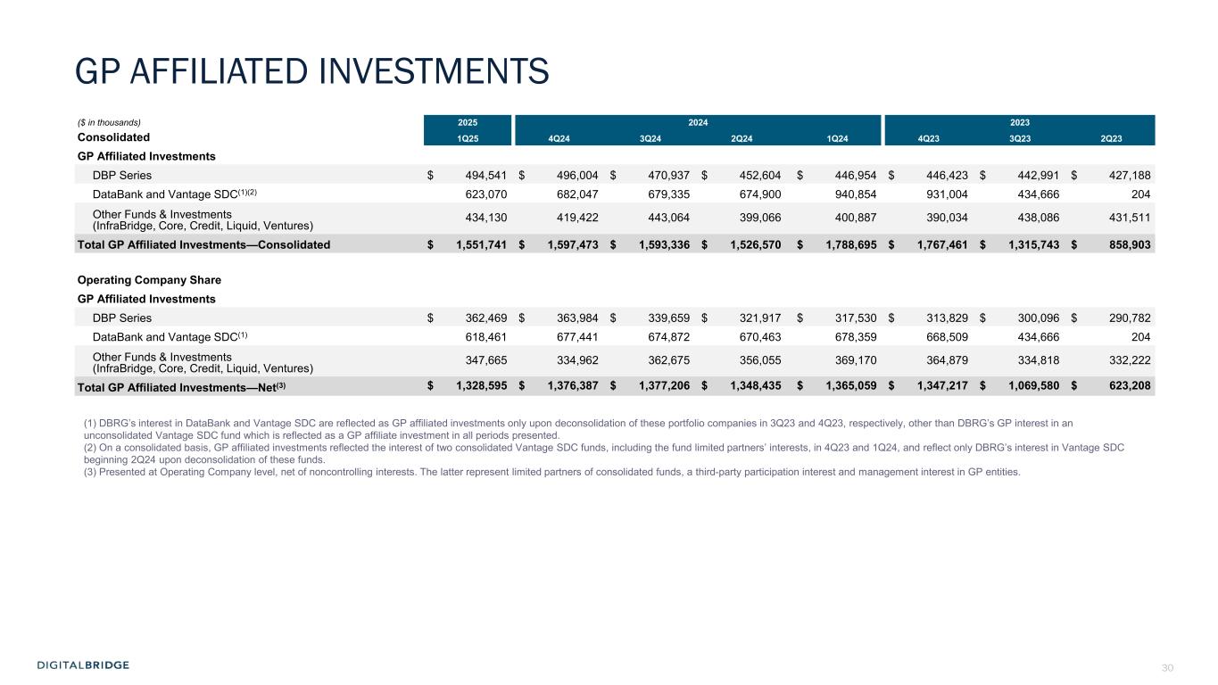 30 ($ in thousands) 2025 2024 2023 Consolidated 1Q25 4Q24 3Q24 2Q24 1Q24 4Q23 3Q23 2Q23 GP Affiliated Investments DBP Series $ 494,541 $ 496,004 $ 470,937 $ 452,604 $ 446,954 $ 446,423 $ 442,991 $ 427,188 DataBank and Vantage SDC(1)(2) 623,070 682,047 679,335 674,900 940,854 931,004 434,666 204 Other Funds & Investments (InfraBridge, Core, Credit, Liquid, Ventures) 434,130 419,422 443,064 399,066 400,887 390,034 438,086 431,511 Total GP Affiliated Investments—Consolidated $ 1,551,741 $ 1,597,473 $ 1,593,336 $ 1,526,570 $ 1,788,695 $ 1,767,461 $ 1,315,743 $ 858,903 Operating Company Share GP Affiliated Investments DBP Series $ 362,469 $ 363,984 $ 339,659 $ 321,917 $ 317,530 $ 313,829 $ 300,096 $ 290,782 DataBank and Vantage SDC(1) 618,461 677,441 674,872 670,463 678,359 668,509 434,666 204 Other Funds & Investments (InfraBridge, Core, Credit, Liquid, Ventures) 347,665 334,962 362,675 356,055 369,170 364,879 334,818 332,222 Total GP Affiliated Investments—Net(3) $ 1,328,595 $ 1,376,387 $ 1,377,206 $ 1,348,435 $ 1,365,059 $ 1,347,217 $ 1,069,580 $ 623,208 GP AFFILIATED INVESTMENTS (1) DBRG’s interest in DataBank and Vantage SDC are reflected as GP affiliated investments only upon deconsolidation of these portfolio companies in 3Q23 and 4Q23, respectively, other than DBRG’s GP interest in an unconsolidated Vantage SDC fund which is reflected as a GP affiliate investment in all periods presented. (2) On a consolidated basis, GP affiliated investments reflected the interest of two consolidated Vantage SDC funds, including the fund limited partners’ interests, in 4Q23 and 1Q24, and reflect only DBRG’s interest in Vantage SDC beginning 2Q24 upon deconsolidation of these funds. (3) Presented at Operating Company level, net of noncontrolling interests. The latter represent limited partners of consolidated funds, a third-party participation interest and management interest in GP entities.