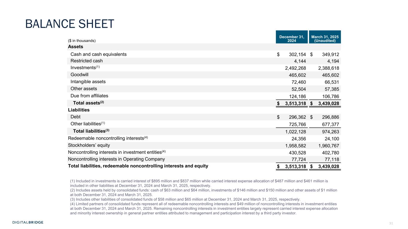 31 ($ in thousands) December 31, 2024 March 31, 2025 (Unaudited) Assets Cash and cash equivalents $ 302,154 $ 349,912 Restricted cash 4,144 4,194 Investments(1) 2,492,268 2,388,618 Goodwill 465,602 465,602 Intangible assets 72,460 66,531 Other assets 52,504 57,385 Due from affiliates 124,186 106,786 Total assets(2) $ 3,513,318 $ 3,439,028 Liabilities Debt $ 296,362 $ 296,886 Other liabilities(1) 725,766 677,377 Total liabilities(3) 1,022,128 974,263 Redeemable noncontrolling interests(4) 24,356 24,100 Stockholders’ equity 1,958,582 1,960,767 Noncontrolling interests in investment entities(4) 430,528 402,780 Noncontrolling interests in Operating Company 77,724 77,118 Total liabilities, redeemable noncontrolling interests and equity $ 3,513,318 $ 3,439,028 (1) Included in investments is carried interest of $895 million and $837 million while carried interest expense allocation of $487 million and $461 million is included in other liabilities at December 31, 2024 and March 31, 2025, respectively. (2) Includes assets held by consolidated funds: cash of $63 million and $64 million, investments of $146 million and $150 million and other assets of $1 million at both December 31, 2024 and March 31, 2025. (3) Includes other liabilities of consolidated funds of $58 million and $65 million at December 31, 2024 and March 31, 2025, respectively. (4) Limited partners of consolidated funds represent all of redeemable noncontrolling interests and $49 million of noncontrolling interests in investment entities at both December 31, 2024 and March 31, 2025. Remaining noncontrolling interests in investment entities largely represent carried interest expense allocation and minority interest ownership in general partner entities attributed to management and participation interest by a third party investor. BALANCE SHEET