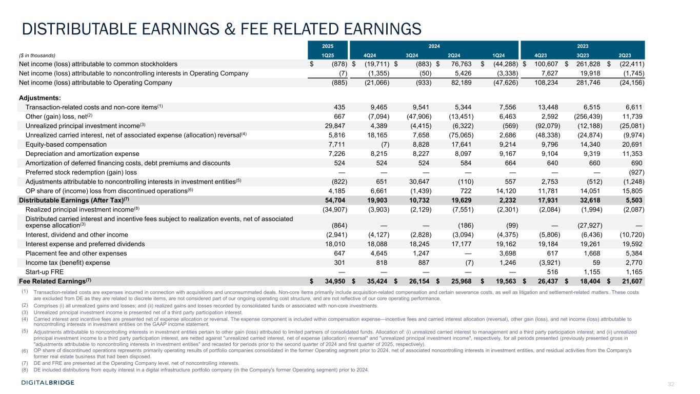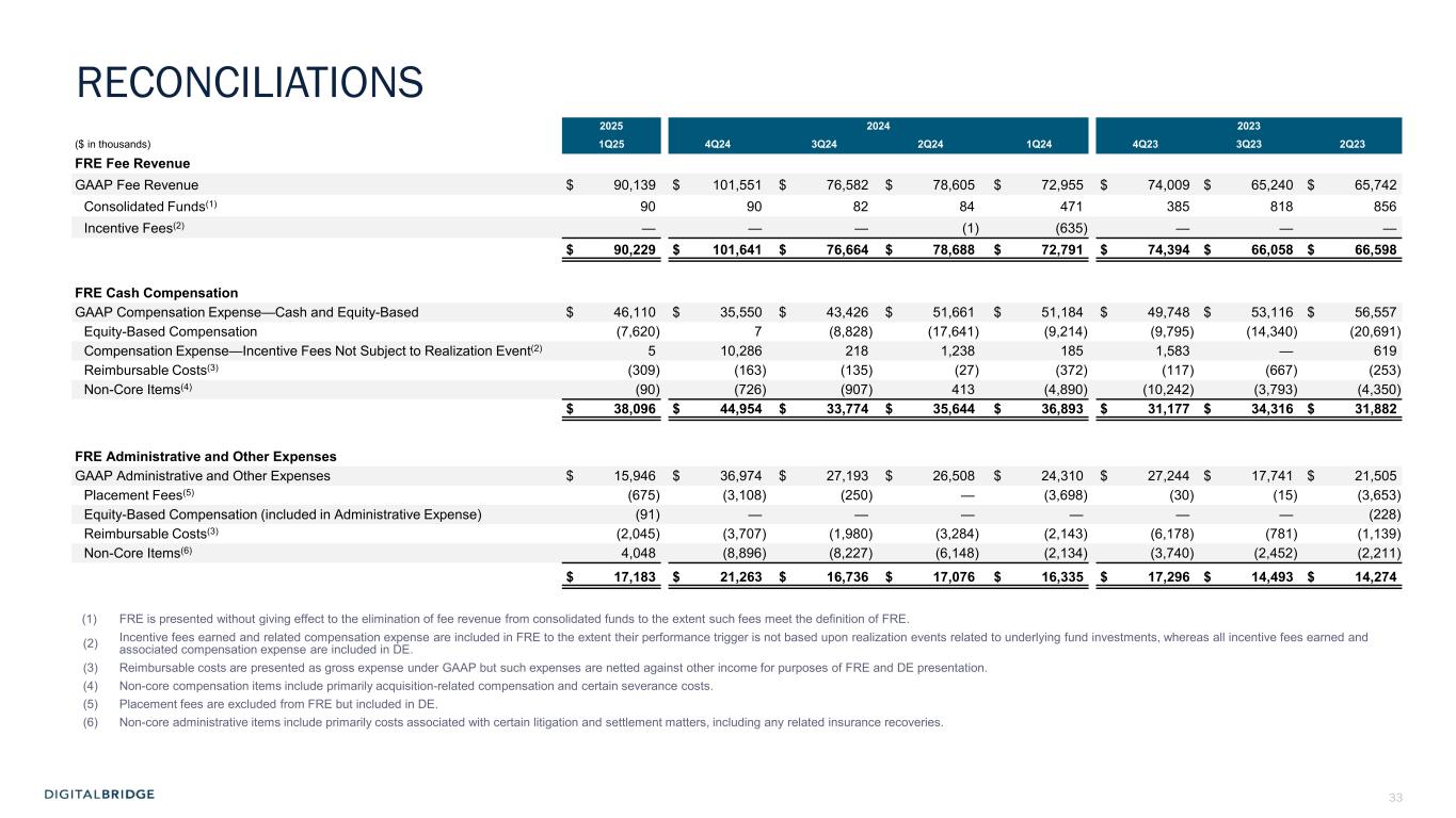 32 DISTRIBUTABLE EARNINGS & FEE RELATED EARNINGS 2025 2024 2023 ($ in thousands) 1Q25 4Q24 3Q24 2Q24 1Q24 4Q23 3Q23 2Q23 Net income (loss) attributable to common stockholders $ (878) $ (19,711) $ (883) $ 76,763 $ (44,288) $ 100,607 $ 261,828 $ (22,411) Net income (loss) attributable to noncontrolling interests in Operating Company (7) (1,355) (50) 5,426 (3,338) 7,627 19,918 (1,745) Net income (loss) attributable to Operating Company (885) (21,066) (933) 82,189 (47,626) 108,234 281,746 (24,156) Adjustments: Transaction-related costs and non-core items(1) 435 9,465 9,541 5,344 7,556 13,448 6,515 6,611 Other (gain) loss, net(2) 667 (7,094) (47,906) (13,451) 6,463 2,592 (256,439) 11,739 Unrealized principal investment income(3) 29,847 4,389 (4,415) (6,322) (569) (92,079) (12,188) (25,081) Unrealized carried interest, net of associated expense (allocation) reversal(4) 5,816 18,165 7,658 (75,065) 2,686 (48,338) (24,874) (9,974) Equity-based compensation 7,711 (7) 8,828 17,641 9,214 9,796 14,340 20,691 Depreciation and amortization expense 7,226 8,215 8,227 8,097 9,167 9,104 9,319 11,353 Amortization of deferred financing costs, debt premiums and discounts 524 524 524 584 664 640 660 690 Preferred stock redemption (gain) loss — — — — — — — (927) Adjustments attributable to noncontrolling interests in investment entities(5) (822) 651 30,647 (110) 557 2,753 (512) (1,248) OP share of (income) loss from discontinued operations(6) 4,185 6,661 (1,439) 722 14,120 11,781 14,051 15,805 Distributable Earnings (After Tax)(7) 54,704 19,903 10,732 19,629 2,232 17,931 32,618 5,503 Realized principal investment income(8) (34,907) (3,903) (2,129) (7,551) (2,301) (2,084) (1,994) (2,087) Distributed carried interest and incentive fees subject to realization events, net of associated expense allocation(3) (864) — — (186) (99) — (27,927) — Interest, dividend and other income (2,941) (4,127) (2,828) (3,094) (4,375) (5,806) (6,436) (10,720) Interest expense and preferred dividends 18,010 18,088 18,245 17,177 19,162 19,184 19,261 19,592 Placement fee and other expenses 647 4,645 1,247 — 3,698 617 1,668 5,384 Income tax (benefit) expense 301 818 887 (7) 1,246 (3,921) 59 2,770 Start-up FRE — — — — — 516 1,155 1,165 Fee Related Earnings(7) $ 34,950 $ 35,424 $ 26,154 $ 25,968 $ 19,563 $ 26,437 $ 18,404 $ 21,607 (1) Transaction-related costs are expenses incurred in connection with acquisitions and unconsummated deals. Non-core items primarily include acquisition-related compensation and certain severance costs, as well as litigation and settlement-related matters. These costs are excluded from DE as they are related to discrete items, are not considered part of our ongoing operating cost structure, and are not reflective of our core operating performance. (2) Comprises (i) all unrealized gains and losses; and (ii) realized gains and losses recorded by consolidated funds or associated with non-core investments. (3) Unrealized principal investment income is presented net of a third party participation interest. (4) Carried interest and incentive fees are presented net of expense allocation or reversal. The expense component is included within compensation expense—incentive fees and carried interest allocation (reversal), other gain (loss), and net income (loss) attributable to noncontrolling interests in investment entities on the GAAP income statement. (5) Adjustments attributable to noncontrolling interests in investment entities pertain to other gain (loss) attributed to limited partners of consolidated funds. Allocation of: (i) unrealized carried interest to management and a third party participation interest; and (ii) unrealized principal investment income to a third party participation interest, are netted against "unrealized carried interest, net of expense (allocation) reversal" and "unrealized principal investment income", respectively, for all periods presented (previously presented gross in "adjustments attributable to noncontrolling interests in investment entities" and recasted for periods prior to the second quarter of 2024 and first quarter of 2025, respectively). (6) OP share of discontinued operations represents primarily operating results of portfolio companies consolidated in the former Operating segment prior to 2024, net of associated noncontrolling interests in investment entities, and residual activities from the Company's former real estate business that had been disposed. (7) DE and FRE are presented at the Operating Company level, net of noncontrolling interests. (8) DE included distributions from equity interest in a digital infrastructure portfolio company (in the Company's former Operating segment) prior to 2024.