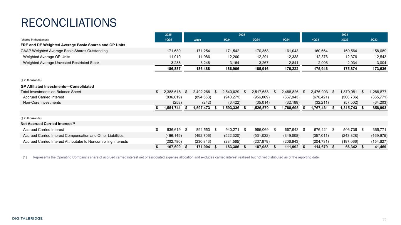 34 2025 2024 2023 ($ in thousands) 1Q25 4Q24 3Q24 2Q24 1Q24 4Q23 3Q23 2Q23 DE Realized Principal Investment Income GAAP Principal Investment Income $ 5,307 $ 1,241 $ 9,955 $ 15,982 $ 2,845 $ 93,534 $ 17,943 $ 30,409 Unrealized Principal Investment (Income) Loss 29,731 3,930 (7,308) (7,813) (468) (93,534) (17,943) (30,409) Noncontrolling Interests in Realized Principal Investment Income (131) (1,268) (518) (618) (76) — — — Other(1) — — — — — 2,084 1,994 2,087 $ 34,907 $ 3,903 $ 2,129 $ 7,551 $ 2,301 $ 2,084 $ 1,994 $ 2,087 DE Realized Carried Interest and Incentive Fees Subject to Realization Events, Net of Associated Expense Allocation GAAP Carried Interest Allocation (Reversal) $ (55,464) $ (45,717) $ (15,799) $ 288,244 $ (8,478) $ 169,686 $ 168,891 $ 79,254 GAAP Compensation Expense—Incentive Fee and Carried Interest (Allocation) Reversal 22,304 18,592 8,474 (178,430) 6,714 (113,920) (72,865) (36,076) (33,160) (27,125) (7,325) 109,814 (1,764) 55,766 96,026 43,178 Unrealized Carried Interest (Allocation) Reversal 57,934 45,717 15,799 (288,126) 8,478 (169,686) (140,964) (79,254) Compensation expense—Unrealized Carried Interest Allocation (Reversal) (23,908) (28,878) (8,692) 177,272 (7,435) 112,337 72,865 35,457 Incentive Fee Revenue Subject to Realization Event(2) — — — 1 635 — — — Compensation Expense—Incentive Fee Not Subject to Realization Event(3) 5 10,286 218 1,238 185 1,583 — 619 Noncontrolling Interests in Realized Carried Interest (7) — — (13) — — — — $ 864 $ — $ — $ 186 $ 99 $ — $ 27,927 $ — (1) Amounts in 2023 represent distributions from equity interest in a digital infrastructure portfolio company (in the Company's former Operating segment). (2) Incentive fees with a performance trigger based upon realization events of underlying fund investments are excluded from FRE but included in DE. (3) Compensation expense related to incentive fees with performance trigger not based upon realization events of underlying fund investments is already included in FRE. RECONCILIATIONS