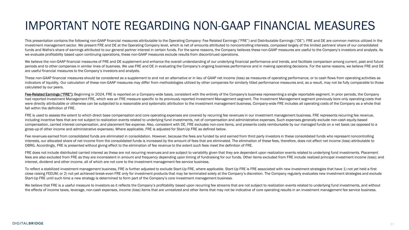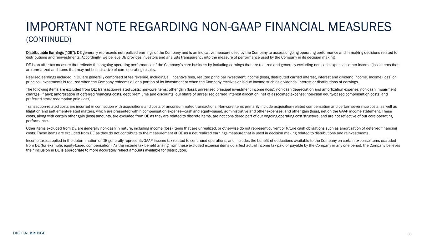 37 IMPORTANT NOTE REGARDING NON-GAAP FINANCIAL MEASURES This presentation contains the following non-GAAP financial measures attributable to the Operating Company: Fee Related Earnings (“FRE”) and Distributable Earnings (“DE”). FRE and DE are common metrics utilized in the investment management sector. We present FRE and DE at the Operating Company level, which is net of amounts attributed to noncontrolling interests, composed largely of the limited partners' share of our consolidated funds and Wafra's share of earnings attributed to our general partner interest in certain funds. For the same reasons, the Company believes these non-GAAP measures are useful to the Company’s investors and analysts. As we evaluate profitability based upon continuing operations, these non-GAAP measures exclude results from discontinued operations. We believe the non-GAAP financial measures of FRE and DE supplement and enhance the overall understanding of our underlying financial performance and trends, and facilitate comparison among current, past and future periods and to other companies in similar lines of business. We use FRE and DE in evaluating the Company’s ongoing business performance and in making operating decisions. For the same reasons, we believe FRE and DE are useful financial measures to the Company’s investors and analysts. These non-GAAP financial measures should be considered as a supplement to and not an alternative or in lieu of GAAP net income (loss) as measures of operating performance, or to cash flows from operating activities as indicators of liquidity. Our calculation of these non-GAAP measures may differ from methodologies utilized by other companies for similarly titled performance measures and, as a result, may not be fully comparable to those calculated by our peers. Fee-Related Earnings (“FRE”): Beginning in 2024, FRE is reported on a Company-wide basis, consistent with the entirety of the Company's business representing a single reportable segment. In prior periods, the Company had reported Investment Management FRE, which was an FRE measure specific to its previously reported Investment Management segment. The Investment Management segment previously bore only operating costs that were directly attributable or otherwise can be subjected to a reasonable and systematic attribution to the investment management business. Company-wide FRE includes all operating costs of the Company as a whole that fall within the definition of FRE. FRE is used to assess the extent to which direct base compensation and core operating expenses are covered by recurring fee revenues in our investment management business. FRE represents recurring fee revenue, including incentive fees that are not subject to realization events related to underlying fund investments, net of compensation and administrative expenses. Such expenses generally exclude non-cash equity-based compensation, carried interest compensation, and placement fee expense. Also, consistent with DE, FRE excludes non-core items, and presents costs reimbursable by our managed funds on a net basis (as opposed to a gross-up of other income and administrative expenses). Where applicable, FRE is adjusted for Start-Up FRE as defined below. Fee revenues earned from consolidated funds are eliminated in consolidation. However, because the fees are funded by and earned from third party investors in these consolidated funds who represent noncontrolling interests, our allocated share of net income from the consolidated funds is increased by the amount of fees that are eliminated. The elimination of these fees, therefore, does not affect net income (loss) attributable to DBRG. Accordingly, FRE is presented without giving effect to the elimination of fee revenue to the extent such fees meet the definition of FRE. FRE does not include distributed carried interest as these are not recurring revenues and are subject to variability given that they are dependent upon realization events related to underlying fund investments. Placement fees are also excluded from FRE as they are inconsistent in amount and frequency depending upon timing of fundraising for our funds. Other items excluded from FRE include realized principal investment income (loss); and interest, dividend and other income, all of which are not core to the investment management fee service business. To reflect a stabilized investment management business, FRE is further adjusted to exclude Start-Up FRE, where applicable. Start-Up FRE is FRE associated with new investment strategies that have 1) not yet held a first close raising FEEUM; or 2) not yet achieved break-even FRE only for investment products that may be terminated solely at the Company’s discretion. The Company regularly evaluates new investment strategies and exclude Start-Up FRE until such time a new strategy is determined to form part of the Company’s core investment management business. We believe that FRE is a useful measure to investors as it reflects the Company’s profitability based upon recurring fee streams that are not subject to realization events related to underlying fund investments, and without the effects of income taxes, leverage, non-cash expenses, income (loss) items that are unrealized and other items that may not be indicative of core operating results in an investment management fee service business.