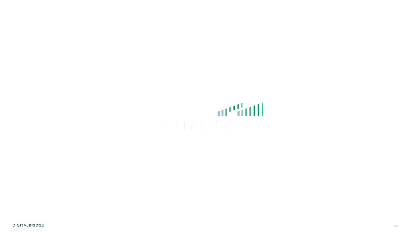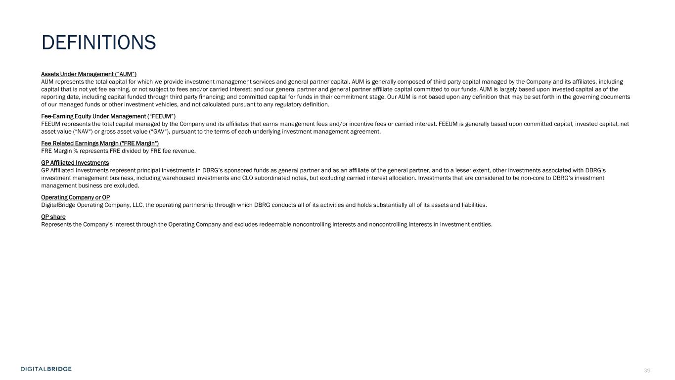 39 DEFINITIONS Assets Under Management (“AUM”) AUM represents the total capital for which we provide investment management services and general partner capital. AUM is generally composed of third party capital managed by the Company and its affiliates, including capital that is not yet fee earning, or not subject to fees and/or carried interest; and our general partner and general partner affiliate capital committed to our funds. AUM is largely based upon invested capital as of the reporting date, including capital funded through third party financing; and committed capital for funds in their commitment stage. Our AUM is not based upon any definition that may be set forth in the governing documents of our managed funds or other investment vehicles, and not calculated pursuant to any regulatory definition. Fee-Earning Equity Under Management (“FEEUM”) FEEUM represents the total capital managed by the Company and its affiliates that earns management fees and/or incentive fees or carried interest. FEEUM is generally based upon committed capital, invested capital, net asset value (“NAV“) or gross asset value (“GAV“), pursuant to the terms of each underlying investment management agreement. Fee Related Earnings Margin ("FRE Margin") FRE Margin % represents FRE divided by FRE fee revenue. GP Affiliated Investments GP Affiliated Investments represent principal investments in DBRG’s sponsored funds as general partner and as an affiliate of the general partner, and to a lesser extent, other investments associated with DBRG’s investment management business, including warehoused investments and CLO subordinated notes, but excluding carried interest allocation. Investments that are considered to be non-core to DBRG’s investment management business are excluded. Operating Company or OP DigitalBridge Operating Company, LLC, the operating partnership through which DBRG conducts all of its activities and holds substantially all of its assets and liabilities. OP share Represents the Company’s interest through the Operating Company and excludes redeemable noncontrolling interests and noncontrolling interests in investment entities.
