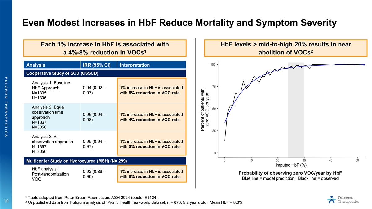 FULCRUM THERAPEUTICS Even Modest Increases in HbF Reduce Mortality and Symptom Severity Each 1% increase in HbF is associated with HbF levels > mid-to-high 20% results in near 1 2 a 4%-8% reduction in VOCs abolition of VOCs 100 Analysis IRR (95% CI) Interpretation Cooperative Study of SCD (CSSCD) Analysis 1: Baseline 75 0.94 (0.92 – 1% increase in HbF is associated HbF Approach N=1395 0.97) with 6% reduction in VOC rate N=1395 Analysis 2: Equal 50 observation time 0.96 (0.94 – 1% increase in HbF is associated approach 0.98) with 4% reduction in VOC rate N=1367 N=3056 25 Analysis 3: All 0.95 (0.94 – 1% increase in HbF is associated observation approach N=1367 0.97) with 5% reduction in VOC rate N=3056 0 0 10 20 30 40 50 Multicenter Study on Hydroxyurea (MSH) (N= 299) Imputed HbF (%) HbF analysis: 0.92 (0.89 – 1% increase in HbF is associated Probability of observing zero VOC/year by HbF Post-randomization 0.96) with 8% reduction in VOC rate Blue line = model prediction; Black line = observed VOC 1 Table adapted from Peter Bruun-Rasmussen. ASH 2024 (poster #1124). 10 2 Unpublished data from Fulcrum analysis of Picnic Health real-world dataset, n = 673; ≥ 2 years old ; Mean HbF = 8.6% Percent of patients with zero VOC per year