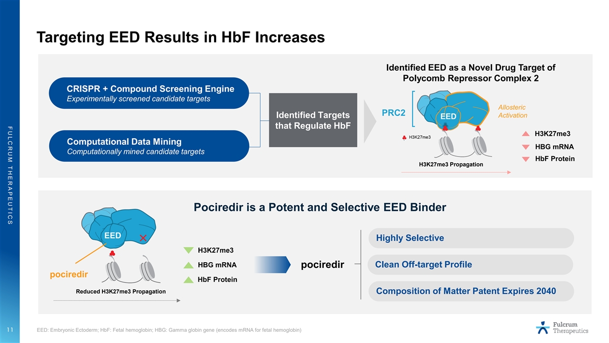 FULCRUM THERAPEUTICS Targeting EED Results in HbF Increases Identified EED as a Novel Drug Target of Polycomb Repressor Complex 2 CRISPR + Compound Screening Engine Experimentally screened candidate targets Allosteric PRC2 Activation Identified Targets that Regulate HbF H3K27me3 Computational Data Mining HBG mRNA Computationally mined candidate targets HbF Protein H3K27me3 Propagation Pociredir is a Potent and Selective EED Binder EED Highly Selective H3K27me3 HBG mRNA Clean Off-target Profile pociredir pociredir HbF Protein Reduced H3K27me3 Propagation Composition of Matter Patent Expires 2040 11 EED: Embryonic Ectoderm; HbF: Fetal hemoglobin; HBG: Gamma globin gene (encodes mRNA for fetal hemoglobin)