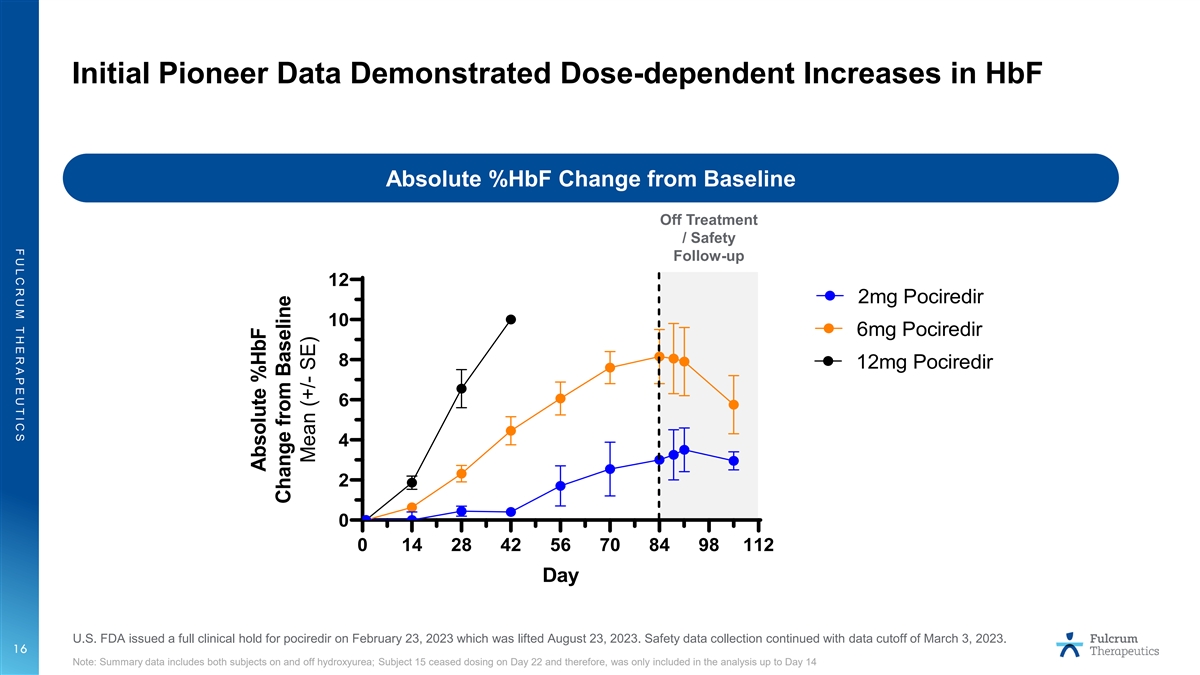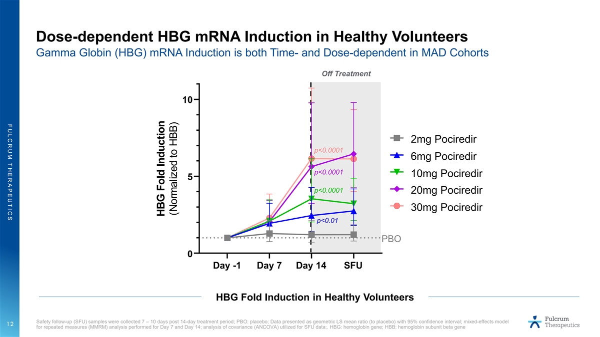 FULCRUM THERAPEUTICS Dose-dependent HBG mRNA Induction in Healthy Volunteers Gamma Globin (HBG) mRNA Induction is both Time- and Dose-dependent in MAD Cohorts Off Treatment 10 2mg Pociredir p<0.0001 6mg Pociredir p<0.0001 10mg Pociredir 5 p<0.0001 20mg Pociredir 30mg Pociredir p<0.01 PBO 0 Day -1 Day 7 Day 14 SFU HBG Fold Induction in Healthy Volunteers Safety follow-up (SFU) samples were collected 7 – 10 days post 14-day treatment period; PBO: placebo; Data presented as geometric LS mean ratio (to placebo) with 95% confidence interval; mixed-effects model 12 for repeated measures (MMRM) analysis performed for Day 7 and Day 14; analysis of covariance (ANCOVA) utilized for SFU data;. HBG: hemoglobin gene; HBB: hemoglobin subunit beta gene HBG Fold Induction (Normalized to HBB)