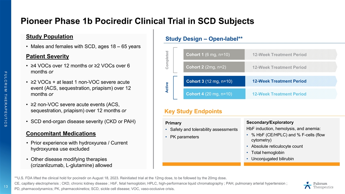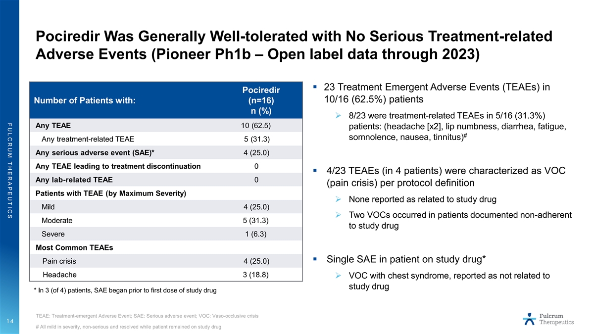 FULCRUM THERAPEUTICS Pioneer Phase 1b Pociredir Clinical Trial in SCD Subjects Study Population Study Design – Open-label** • Males and females with SCD, ages 18 – 65 years Cohort 1 (6 mg, n=10) 12-Week Treatment Period Patient Severity • ≥4 VOCs over 12 months or ≥2 VOCs over 6 Cohort 2 (2mg, n=2) 12-Week Treatment Period months or 12-Week Treatment Period Cohort 3 (12 mg, n=10) • ≥2 VOCs + at least 1 non-VOC severe acute event (ACS, sequestration, priapism) over 12 Cohort 4 (20 mg, n=10) 12-Week Treatment Period months or • ≥2 non-VOC severe acute events (ACS, sequestration, priapism) over 12 months or Key Study Endpoints • SCD end-organ disease severity (CKD or PAH) Secondary/Exploratory Primary HbF induction, hemolysis, and anemia: • Safety and tolerability assessments Concomitant Medications • % HbF (CE/HPLC) and % F-cells (flow • PK parameters cytometry) • Prior experience with hydroxyurea / Current • Absolute reticulocyte count hydroxyurea use excluded • Total hemoglobin • Unconjugated bilirubin • Other disease modifying therapies (crizanlizumab, L-glutamine) allowed **U.S. FDA lifted the clinical hold for pociredir on August 18, 2023. Reinitiated trial at the 12mg dose, to be followed by the 20mg dose. CE, capillary electropherisis ; CKD, chronic kidney disease ; HbF, fetal hemoglobin; HPLC, high-performance liquid chromatography ; PAH, pulmonary arterial hypertension ; 13 PD, pharmacodynamics; PK, pharmacokinetics; SCD, sickle cell disease; VOC, vaso-occlusive crisis. Active Completed