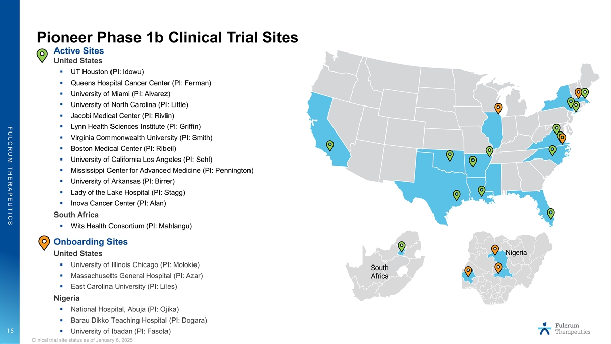 FULCRUM THERAPEUTICS Pioneer Phase 1b Clinical Trial Sites Active Sites United States § UT Houston (PI: Idowu) § Queens Hospital Cancer Center (PI: Ferman) § University of Miami (PI: Alvarez) § University of North Carolina (PI: Little) § Jacobi Medical Center (PI: Rivlin) § Lynn Health Sciences Institute (PI: Griffin) § Virginia Commonwealth University (PI: Smith) § Boston Medical Center (PI: Ribeil) § University of California Los Angeles (PI: Sehl) § Mississippi Center for Advanced Medicine (PI: Pennington) § University of Arkansas (PI: Birrer) § Lady of the Lake Hospital (PI: Stagg) § Inova Cancer Center (PI: Alan) South Africa § Wits Health Consortium (PI: Mahlangu) Onboarding Sites Nigeria United States § University of Illinois Chicago (PI: Molokie) South § Massachusetts General Hospital (PI: Azar) Africa § East Carolina University (PI: Liles) Nigeria § National Hospital, Abuja (PI: Ojika) § Barau Dikko Teaching Hospital (PI: Dogara) 15 § University of Ibadan (PI: Fasola) Clinical trial site status as of January 6, 2025
