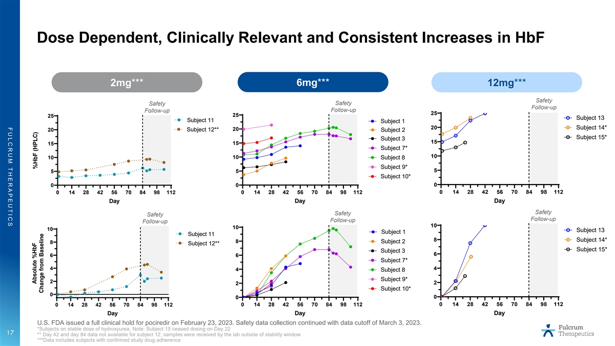 FULCRUM THERAPEUTICS Initial Pioneer Data Demonstrated Dose-dependent Increases in HbF Absolute %HbF Change from Baseline Off Treatment / Safety Follow-up 12 2mg Pociredir 10 6mg Pociredir 8 12mg Pociredir 6 4 2 0 0 14 28 42 56 70 84 98 112 Day U.S. FDA issued a full clinical hold for pociredir on February 23, 2023 which was lifted August 23, 2023. Safety data collection continued with data cutoff of March 3, 2023. 16 Note: Summary data includes both subjects on and off hydroxyurea; Subject 15 ceased dosing on Day 22 and therefore, was only included in the analysis up to Day 14 Absolute %HbF Change from Baseline Mean (+/- SE)
