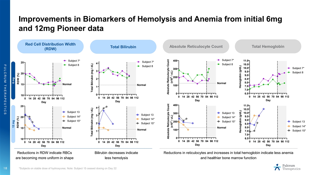 FULCRUM THERAPEUTICS Dose Dependent, Clinically Relevant and Consistent Increases in HbF 6mg*** 2mg*** 12mg*** Safety Safety Safety Follow-up Follow-up Follow-up 25 25 25 Subject 13 Subject 11 Subject 1 20 Subject 14* Subject 12** 20 20 Subject 2 Subject 15* Subject 3 15 15 15 Subject 7* 10 10 10 Subject 8 Subject 9* 5 5 5 Subject 10* 0 0 0 0 14 28 42 56 70 84 98 112 0 14 28 42 56 70 84 98 112 0 14 28 42 56 70 84 98 112 Day Day Day Safety Safety Safety Follow-up Follow-up Follow-up 10 10 10 Subject 13 Subject 1 Subject 11 8 Subject 14* 8 Subject 2 8 Subject 12** Subject 15* Subject 3 6 6 6 Subject 7* 4 4 4 Subject 8 Subject 9* 2 2 2 Subject 10* 0 0 0 0 14 28 42 56 70 84 98 112 0 14 28 42 56 70 84 98 112 0 14 28 42 56 70 84 98 112 Day Day Day U.S. FDA issued a full clinical hold for pociredir on February 23, 2023. Safety data collection continued with data cutoff of March 3, 2023. *Subjects on stable dose of hydroxyurea; Note: Subject 15 ceased dosing on Day 22 17 ** Day 42 and day 84 data not available for subject 12; samples were received by the lab outside of stability window ***Data includes subjects with confirmed study drug adherence Absolute %HbF %HbF (HPLC) Change from Baseline