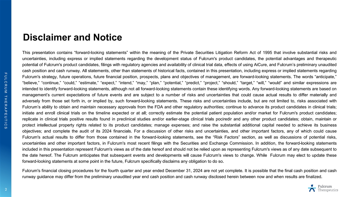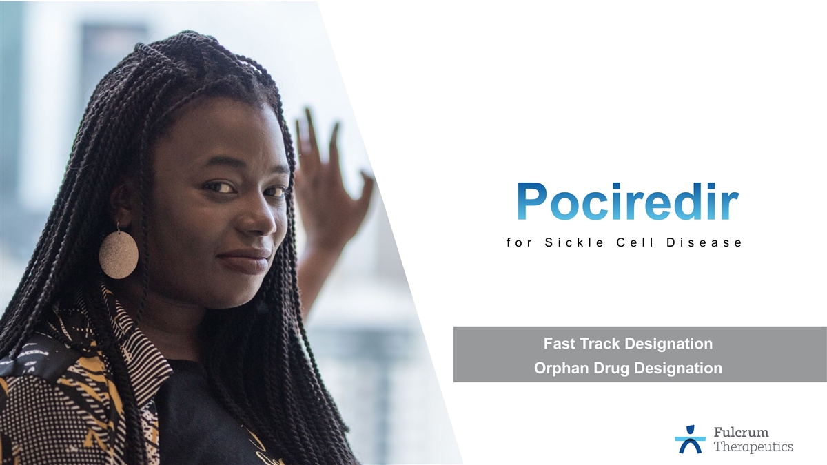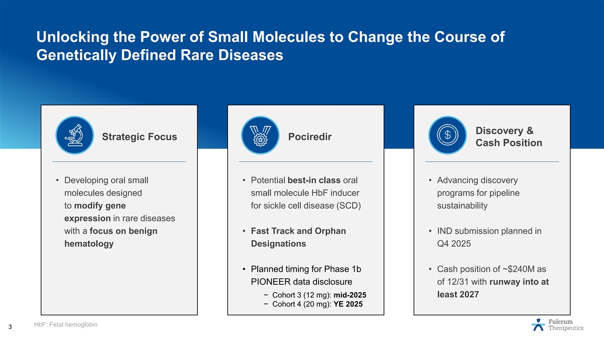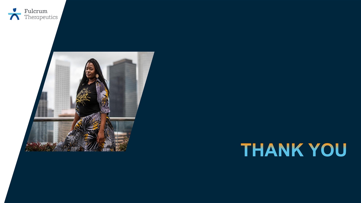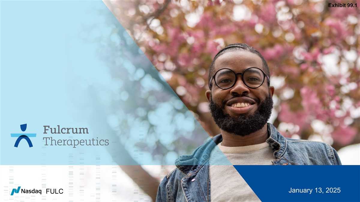 FULCRUM THERAPEUTICS Disclaimer and Notice This presentation contains “forward-looking statements” within the meaning of the Private Securities Litigation Reform Act of 1995 that involve substantial risks and uncertainties, including express or implied statements regarding the development status of Fulcrum's product candidates, the potential advantages and therapeutic potential of Fulcrum's product candidates, filings with regulatory agencies and availability of clinical trial data, effects of using AiCure, and Fulcrum’s preliminary unaudited cash position and cash runway. All statements, other than statements of historical facts, contained in this presentation, including express or implied statements regarding Fulcrum's strategy, future operations, future financial position, prospects, plans and objectives of management, are forward-looking statements. The words “anticipate,” “believe,” “continue,” “could,” “estimate,” “expect,” “intend,” “may,” “plan,” “potential,” “predict,” “project,” “should,” “target,” “will,” “would” and similar expressions are intended to identify forward-looking statements, although not all forward-looking statements contain these identifying words. Any forward-looking statements are based on management’s current expectations of future events and are subject to a number of risks and uncertainties that could cause actual results to differ materially and adversely from those set forth in, or implied by, such forward-looking statements. These risks and uncertainties include, but are not limited to, risks associated with Fulcrum’s ability to obtain and maintain necessary approvals from the FDA and other regulatory authorities; continue to advance its product candidates in clinical trials; initiate and enroll clinical trials on the timeline expected or at all; correctly estimate the potential patient population and/or market for Fulcrum's product candidates; replicate in clinical trials positive results found in preclinical studies and/or earlier-stage clinical trials pociredir and any other product candidates; obtain, maintain or protect intellectual property rights related to its product candidates; manage expenses; and raise the substantial additional capital needed to achieve its business objectives; and complete the audit of its 2024 financials. For a discussion of other risks and uncertainties, and other important factors, any of which could cause Fulcrum's actual results to differ from those contained in the forward-looking statements, see the “Risk Factors” section, as well as discussions of potential risks, uncertainties and other important factors, in Fulcrum's most recent filings with the Securities and Exchange Commission. In addition, the forward-looking statements included in this presentation represent Fulcrum's views as of the date hereof and should not be relied upon as representing Fulcrum's views as of any date subsequent to the date hereof. The Fulcrum anticipates that subsequent events and developments will cause Fulcrum's views to change. While Fulcrum may elect to update these forward-looking statements at some point in the future, Fulcrum specifically disclaims any obligation to do so. Fulcrum's financial closing procedures for the fourth quarter and year ended December 31, 2024 are not yet complete. It is possible that the final cash position and cash runway guidance may differ from the preliminary unaudited year end cash position and cash runway disclosed herein between now and when results are finalized. 2