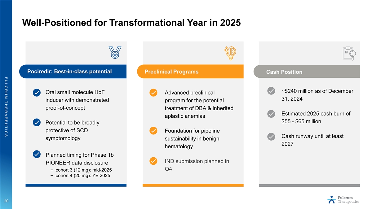 FULCRUM THERAPEUTICS Well-Positioned for Transformational Year in 2025 Pociredir: Best-in-class potential Preclinical Programs Cash Position ~$240 million as of December Oral small molecule HbF Advanced preclinical 31, 2024 inducer with demonstrated program for the potential proof-of-concept treatment of DBA & inherited Estimated 2025 cash burn of aplastic anemias $55 - $65 million Potential to be broadly protective of SCD Foundation for pipeline Cash runway until at least symptomology sustainability in benign 2027 hematology Planned timing for Phase 1b IND submission planned in PIONEER data disclosure Q4 − cohort 3 (12 mg): mid-2025 − cohort 4 (20 mg): YE 2025 20