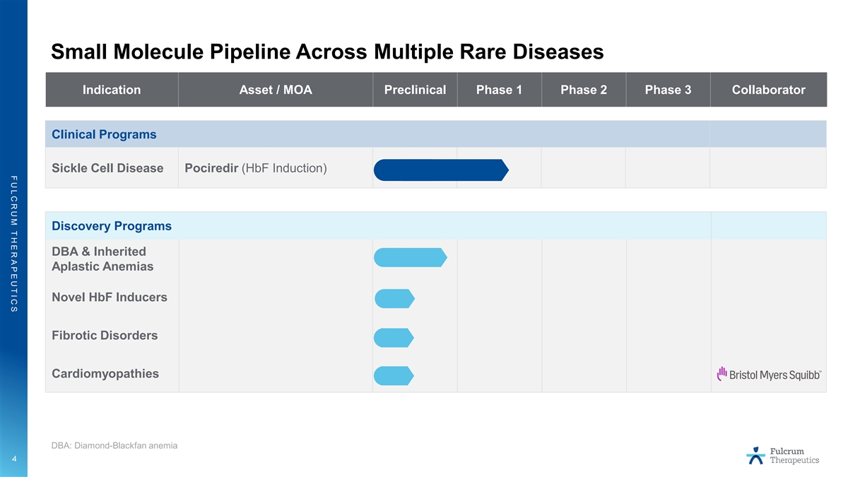 Unlocking the Power of Small Molecules to Change the Course of Genetically Defined Rare Diseases Discovery & Strategic Focus Pociredir Cash Position • Developing oral small • Potential best-in class oral • Advancing discovery molecules designed small molecule HbF inducer programs for pipeline to modify gene for sickle cell disease (SCD) sustainability expression in rare diseases with a focus on benign • Fast Track and Orphan • IND submission planned in hematology Designations Q4 2025 • Planned timing for Phase 1b • Cash position of ~$240M as PIONEER data disclosure of 12/31 with runway into at least 2027 − Cohort 3 (12 mg): mid-2025 − Cohort 4 (20 mg): YE 2025 HbF: Fetal hemoglobin 3