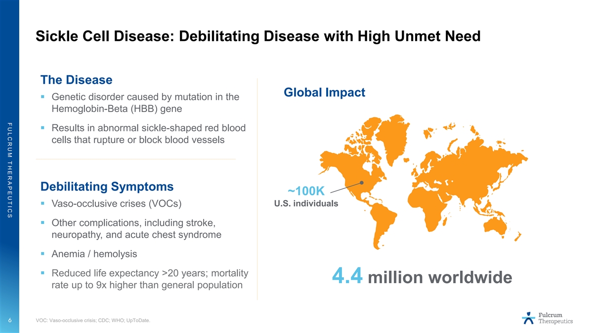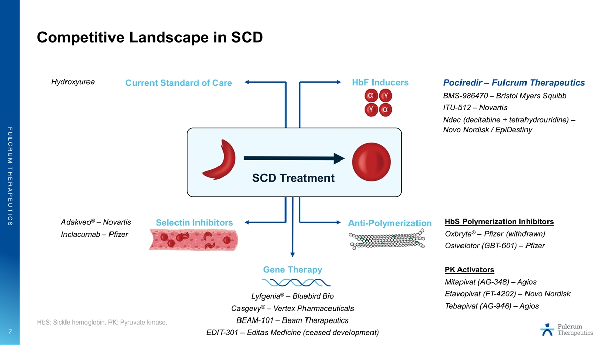 FULCRUM THERAPEUTICS Sickle Cell Disease: Debilitating Disease with High Unmet Need The Disease Global Impact § Genetic disorder caused by mutation in the Hemoglobin-Beta (HBB) gene § Results in abnormal sickle-shaped red blood cells that rupture or block blood vessels Debilitating Symptoms ~100K U.S. individuals § Vaso-occlusive crises (VOCs) § Other complications, including stroke, neuropathy, and acute chest syndrome § Anemia / hemolysis § Reduced life expectancy >20 years; mortality 4.4 million worldwide rate up to 9x higher than general population 6 VOC: Vaso-occlusive crisis; CDC; WHO; UpToDate.