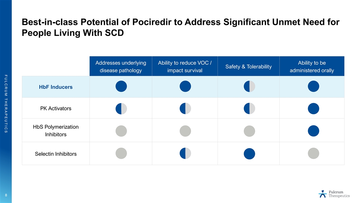 FULCRUM THERAPEUTICS Competitive Landscape in SCD Hydroxyurea HbF Inducers Pociredir – Fulcrum Therapeutics Current Standard of Care γ α BMS-986470 – Bristol Myers Squibb γ ITU-512 – Novartis α Ndec (decitabine + tetrahydrouridine) – Novo Nordisk / EpiDestiny SCD Treatment ® HbS Polymerization Inhibitors Adakveo – Novartis Selectin Inhibitors Anti-Polymerization ® Oxbryta – Pfizer (withdrawn) Inclacumab – Pfizer Osivelotor (GBT-601) – Pfizer PK Activators Gene Therapy Mitapivat (AG-348) – Agios ® Etavopivat (FT-4202) – Novo Nordisk Lyfgenia – Bluebird Bio ® Tebapivat (AG-946) – Agios Casgevy – Vertex Pharmaceuticals BEAM-101 – Beam Therapeutics HbS: Sickle hemoglobin. PK: Pyruvate kinase. 7 EDIT-301 – Editas Medicine (ceased development)