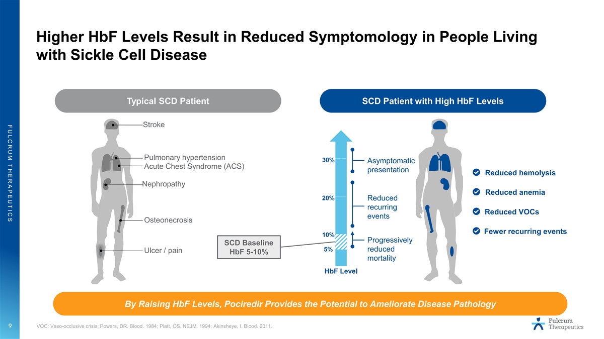 FULCRUM THERAPEUTICS Best-in-class Potential of Pociredir to Address Significant Unmet Need for People Living With SCD Addresses underlying Ability to reduce VOC / Ability to be Safety & Tolerability disease pathology impact survival administered orally HbF Inducers PK Activators HbS Polymerization Inhibitors Selectin Inhibitors 8