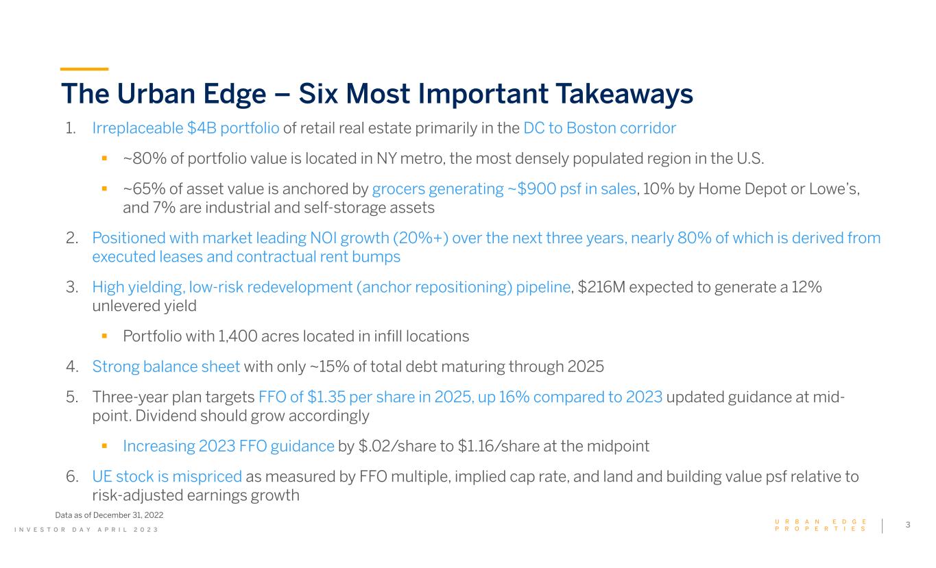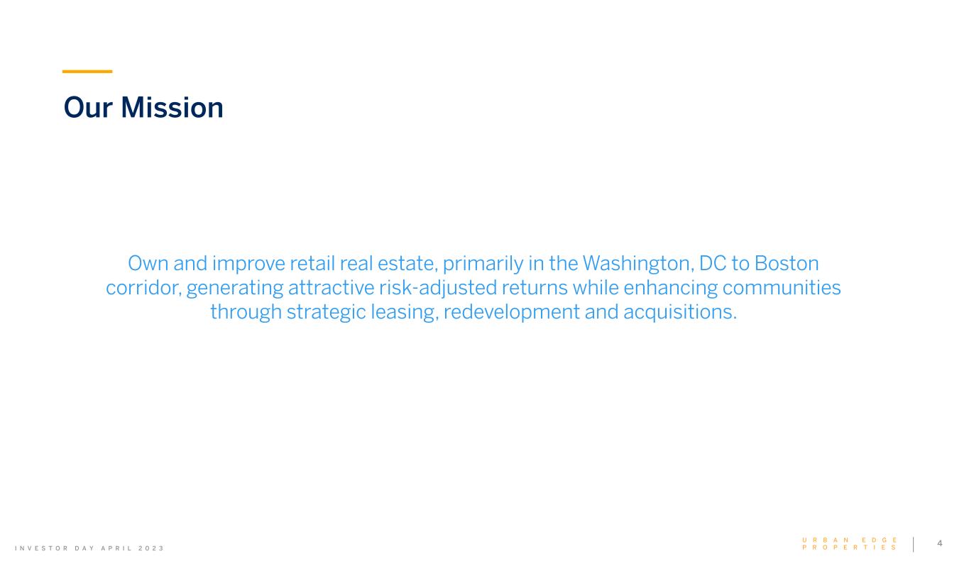I N V E S T O R P R E S E N T A T I O N 3I N V E S T O R D A Y A P R I L 2 0 2 3 U R B A N E D G E P R O P E R T I E S The Urban Edge – Six Most Important Takeaways 1. Irreplaceable $4B portfolio of retail real estate primarily in the DC to Boston corridor  ~80% of portfolio value is located in NY metro, the most densely populated region in the U.S.  ~65% of asset value is anchored by grocers generating ~$900 psf in sales, 10% by Home Depot or Lowe’s, and 7% are industrial and self-storage assets 2. Positioned with market leading NOI growth (20%+) over the next three years, nearly 80% of which is derived from executed leases and contractual rent bumps 3. High yielding, low-risk redevelopment (anchor repositioning) pipeline, $216M expected to generate a 12% unlevered yield  Portfolio with 1,400 acres located in infill locations 4. Strong balance sheet with only ~15% of total debt maturing through 2025 5. Three-year plan targets FFO of $1.35 per share in 2025, up 16% compared to 2023 updated guidance at mid- point. Dividend should grow accordingly  Increasing 2023 FFO guidance by $.02/share to $1.16/share at the midpoint 6. UE stock is mispriced as measured by FFO multiple, implied cap rate, and land and building value psf relative to risk-adjusted earnings growth Data as of December 31, 2022