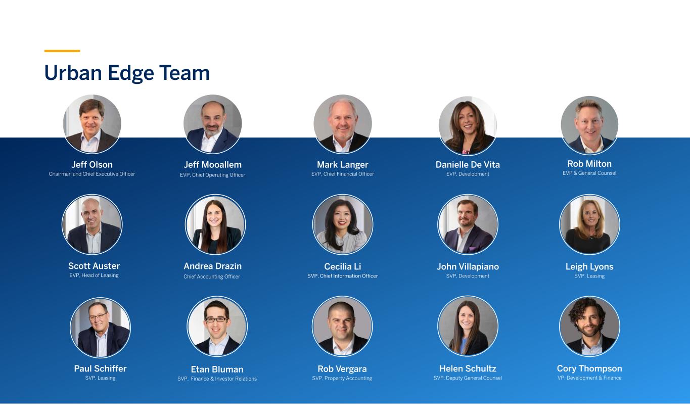 Urban Edge Team Cecilia Li SVP, Chief Information Officer John Villapiano SVP, Development Leigh Lyons SVP, Leasing Scott Auster EVP, Head of Leasing Andrea Drazin Chief Accounting Officer Jeff Olson Chairman and Chief Executive Officer Mark Langer EVP, Chief Financial Officer Danielle De Vita EVP, Development Rob Milton EVP & General Counsel Jeff Mooallem EVP, Chief Operating Officer Cory Thompson VP, Development & Finance Paul Schiffer SVP, Leasing Etan Bluman SVP, Finance & Investor Relations Helen Schultz SVP, Deputy General Counsel Rob Vergara SVP, Property Accounting