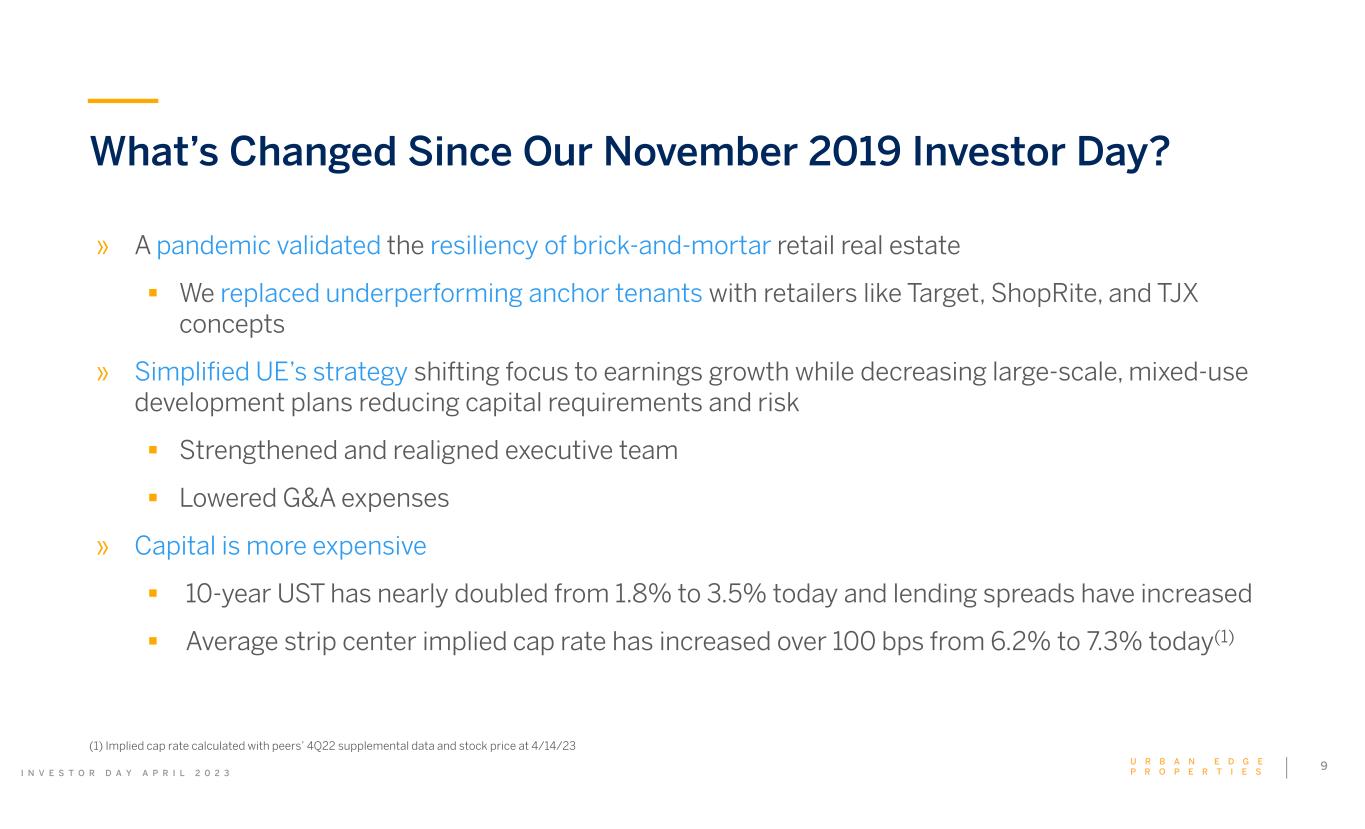 I N V E S T O R P R E S E N T A T I O N 9I N V E S T O R D A Y A P R I L 2 0 2 3 U R B A N E D G E P R O P E R T I E S What’s Changed Since Our November 2019 Investor Day? » A pandemic validated the resiliency of brick-and-mortar retail real estate  We replaced underperforming anchor tenants with retailers like Target, ShopRite, and TJX concepts » Simplified UE’s strategy shifting focus to earnings growth while decreasing large-scale, mixed-use development plans reducing capital requirements and risk  Strengthened and realigned executive team  Lowered G&A expenses » Capital is more expensive  10-year UST has nearly doubled from 1.8% to 3.5% today and lending spreads have increased  Average strip center implied cap rate has increased over 100 bps from 6.2% to 7.3% today(1) (1) Implied cap rate calculated with peers’ 4Q22 supplemental data and stock price at 4/14/23