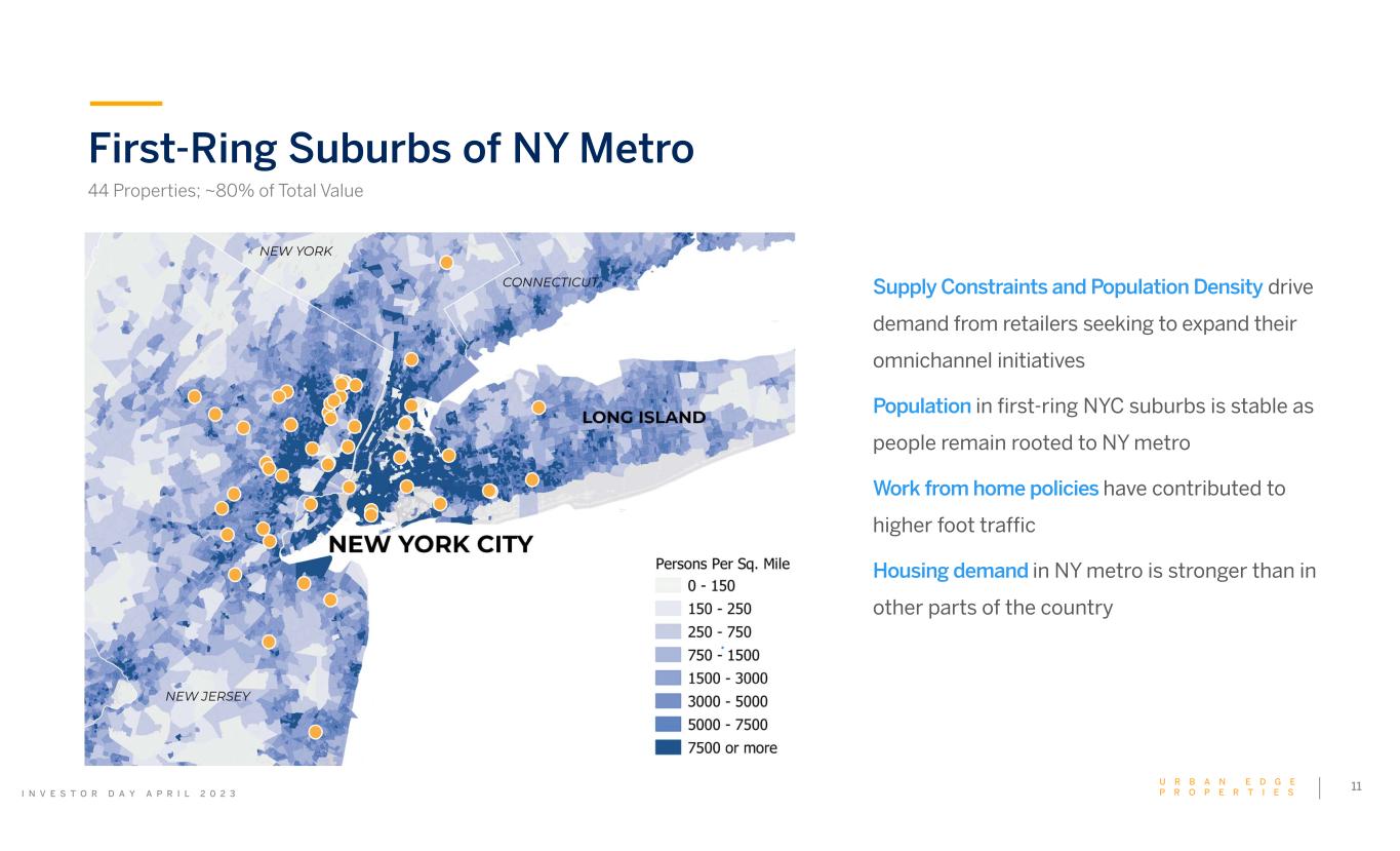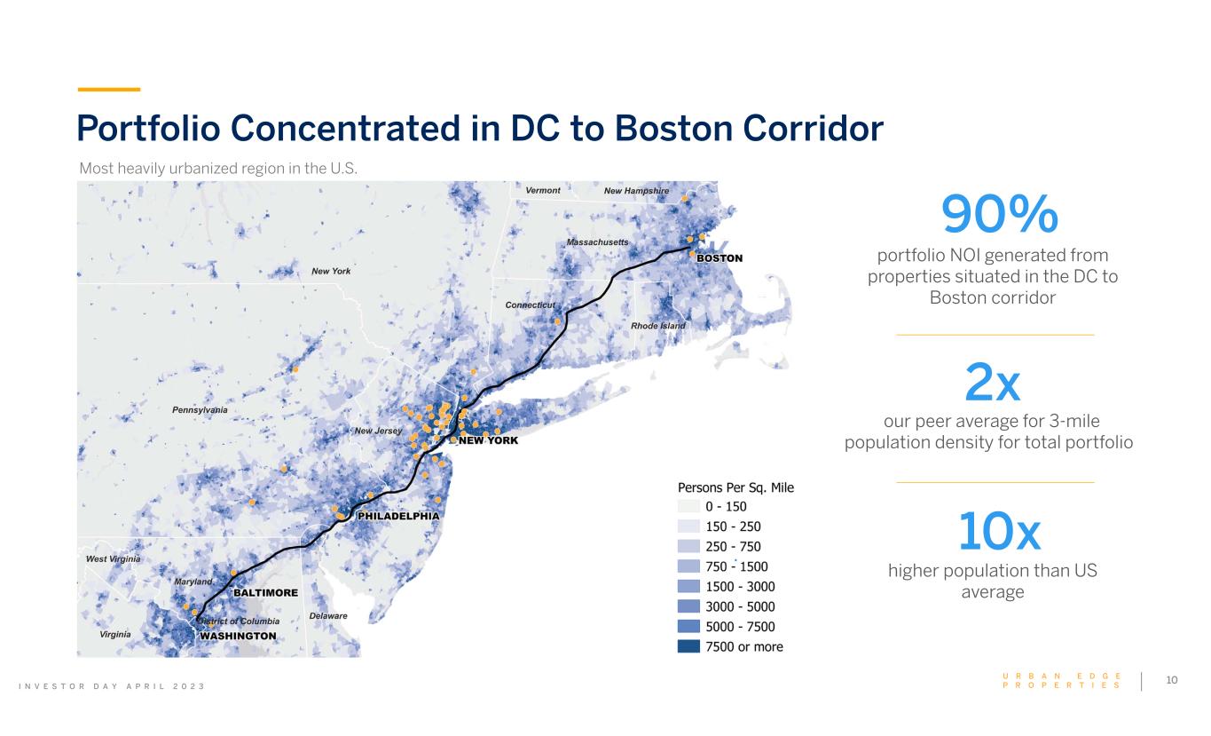 I N V E S T O R P R E S E N T A T I O N 10I N V E S T O R D A Y A P R I L 2 0 2 3 U R B A N E D G E P R O P E R T I E S 1 Portfolio Concentrated in DC to Boston Corridor Most heavily urbanized region in the U.S. 90% portfolio NOI generated from properties situated in the DC to Boston corridor 2x our peer average for 3-mile population density for total portfolio 10x higher population than US average