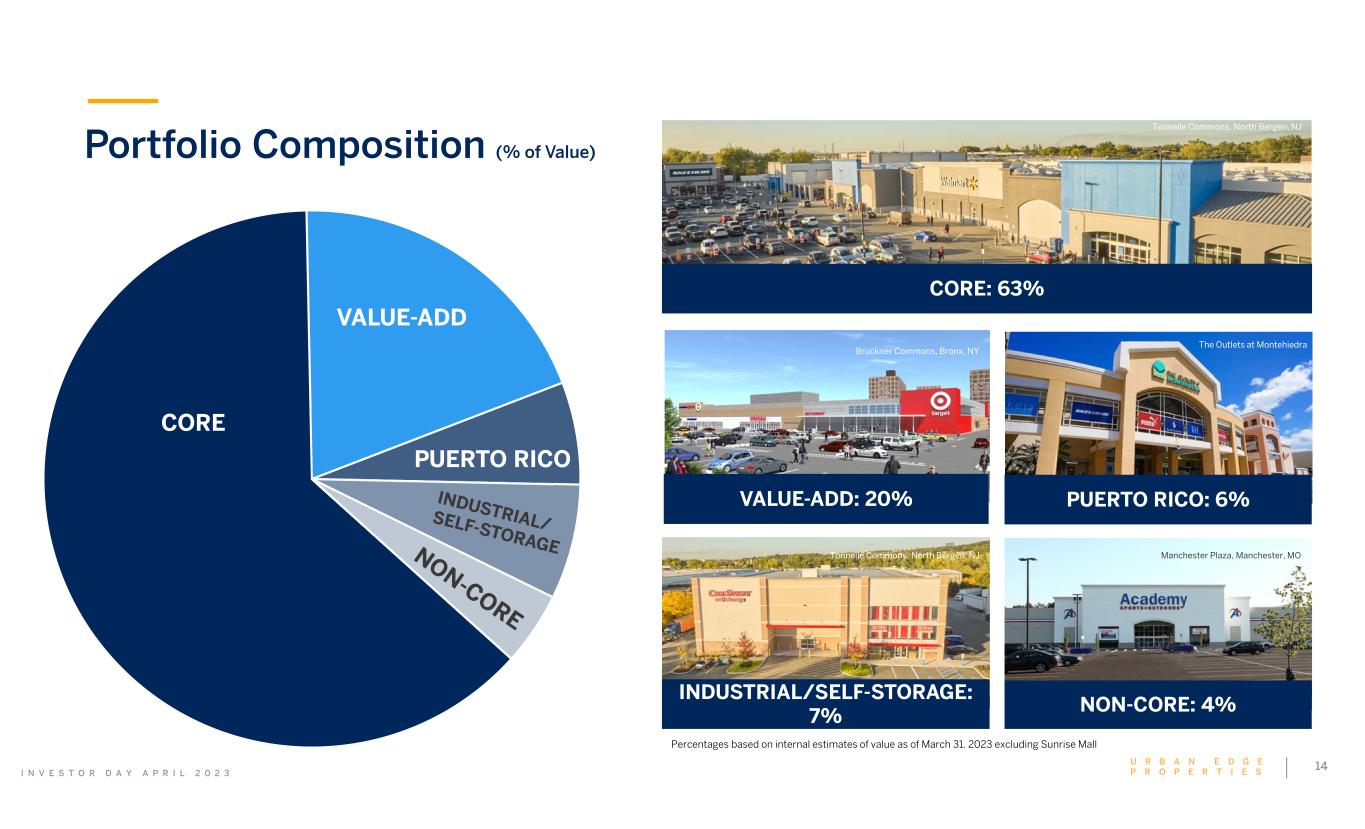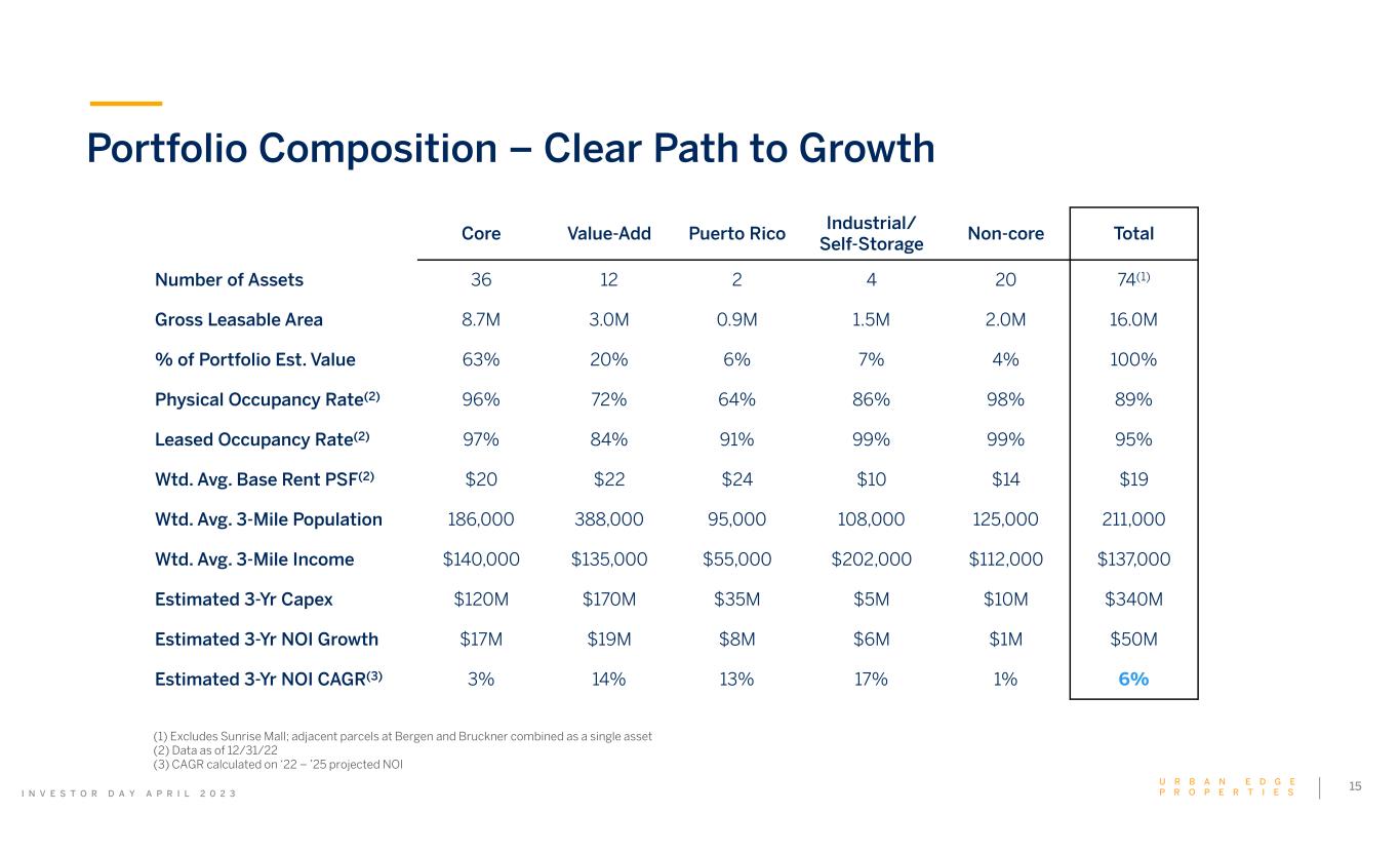 I N V E S T O R D A Y A P R I L 2 0 2 3 U R B A N E D G E P R O P E R T I E S 14 Portfolio Composition (% of Value) INDUSTRIAL/SELF-STORAGE: 7% CORE: 63% Tonnelle Commons, North Bergen, NJ VALUE-ADD: 20% Bruckner Commons, Bronx, NY The Outlets at Montehiedra PUERTO RICO: 6% NON-CORE: 4% VALUE-ADD PUERTO RICO CORE Tonnelle Commons, North Bergen, NJ Manchester Plaza, Manchester, MO Percentages based on internal estimates of value as of March 31. 2023 excluding Sunrise Mall