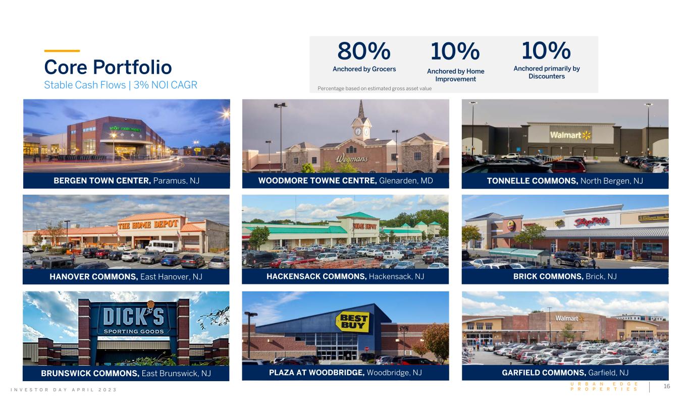 I N V E S T O R D A Y A P R I L 2 0 2 3 U R B A N E D G E P R O P E R T I E S 15 Portfolio Composition – Clear Path to Growth TotalNon-core Industrial/ Self-Storage Puerto RicoValue-AddCore 74(1)20421236Number of Assets 16.0M2.0M1.5M0.9M3.0M8.7MGross Leasable Area 100%4%7%6%20%63%% of Portfolio Est. Value 89%98%86%64%72%96%Physical Occupancy Rate(2) 95%99%99%91%84%97%Leased Occupancy Rate(2) $19$14$10$24$22$20Wtd. Avg. Base Rent PSF(2) 211,000125,000108,00095,000388,000186,000Wtd. Avg. 3-Mile Population $137,000$112,000$202,000$55,000$135,000$140,000Wtd. Avg. 3-Mile Income $340M$10M$5M$35M$170M$120MEstimated 3-Yr Capex $50M$1M$6M$8M$19M$17MEstimated 3-Yr NOI Growth 6%1%17%13%14%3%Estimated 3-Yr NOI CAGR(3) (1) Excludes Sunrise Mall; adjacent parcels at Bergen and Bruckner combined as a single asset (2) Data as of 12/31/22 (3) CAGR calculated on ‘22 – ’25 projected NOI