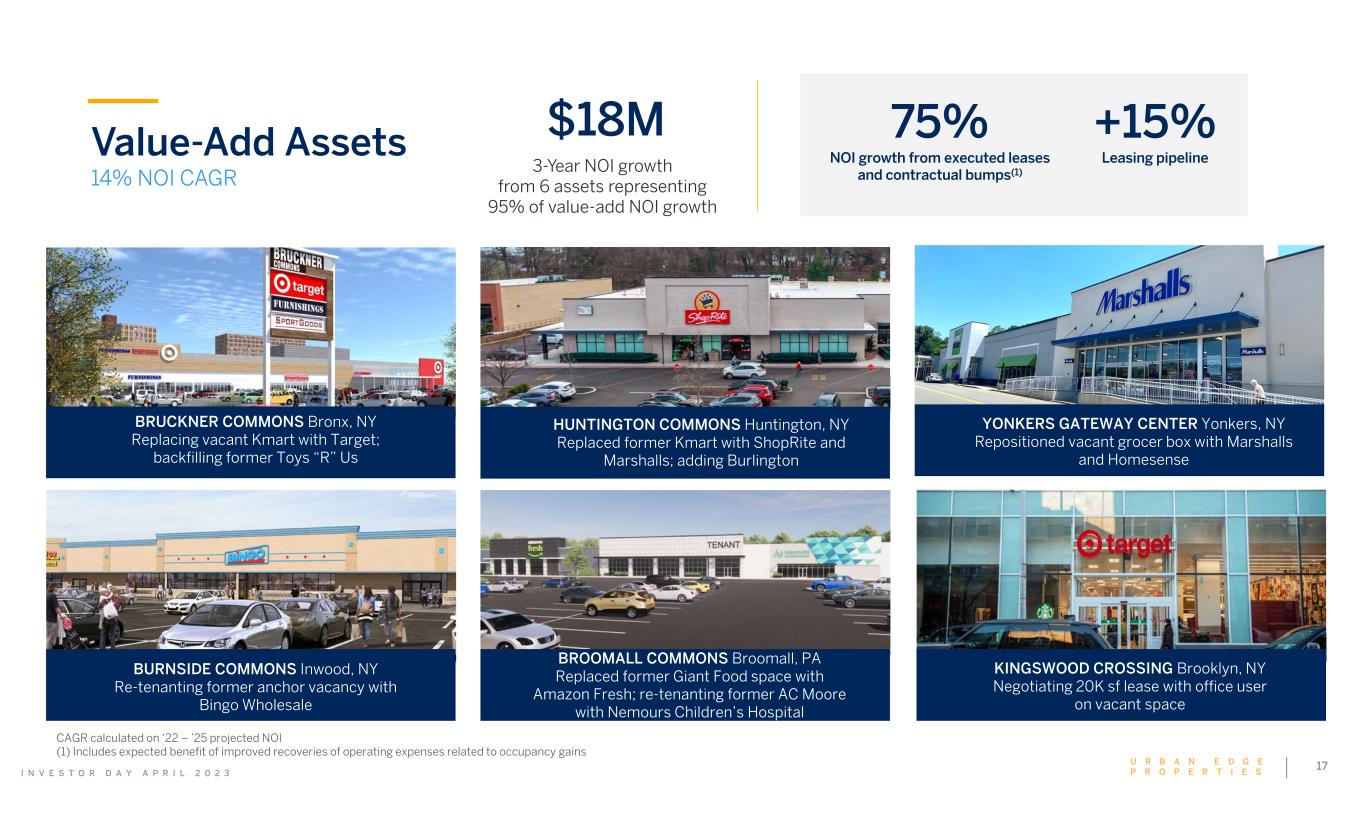 I N V E S T O R D A Y A P R I L 2 0 2 3 U R B A N E D G E P R O P E R T I E S 16 TONNELLE COMMONS, North Bergen, NJWOODMORE TOWNE CENTRE, Glenarden, MD HANOVER COMMONS, East Hanover, NJ HACKENSACK COMMONS, Hackensack, NJ BRICK COMMONS, Brick, NJ BRUNSWICK COMMONS, East Brunswick, NJ PLAZA AT WOODBRIDGE, Woodbridge, NJ GARFIELD COMMONS, Garfield, NJ 80% Anchored by Grocers 10% Anchored primarily by Discounters 10% Anchored by Home Improvement Core Portfolio Stable Cash Flows | 3% NOI CAGR BERGEN TOWN CENTER, Paramus, NJ Percentage based on estimated gross asset value