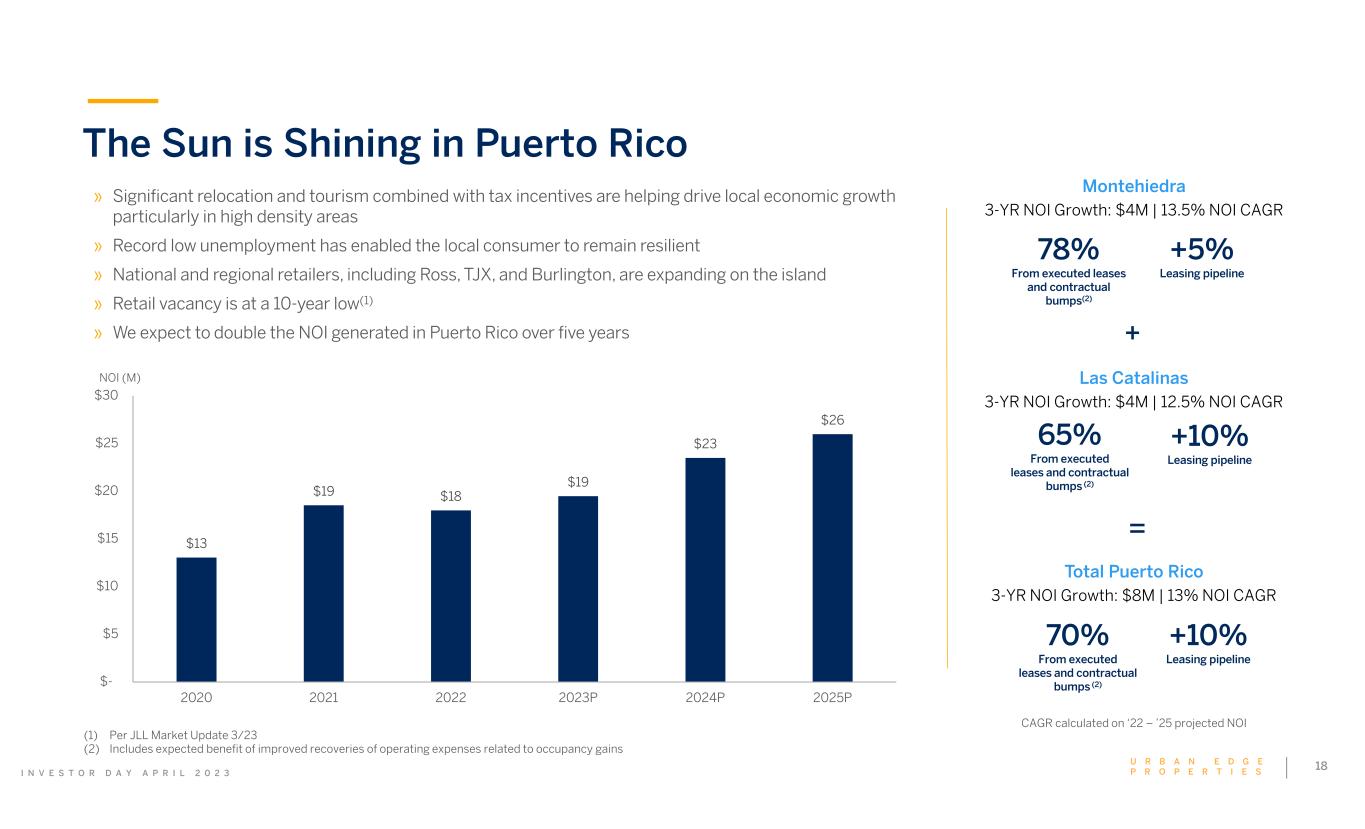 I N V E S T O R D A Y A P R I L 2 0 2 3 U R B A N E D G E P R O P E R T I E S 17 Value-Add Assets 14% NOI CAGR $18M 3-Year NOI growth from 6 assets representing 95% of value-add NOI growth BRUCKNER COMMONS GLA: 712K, Major Tenants: Best Buy BRUCKNERHUNTINGTON YONKERS GATEWAY CENTER Yonkers, NY Repositioned vacant grocer box with Marshalls and Homesense 75% NOI growth from executed leases and contractual bumps(1) +15% Leasing pipeline BROOMALL COMMONS Broomall, PA Replaced former Giant Food space with Amazon Fresh; re-tenanting former AC Moore with Nemours Children’s Hospital BRUCKNER COMMONS Bronx, NY Replacing vacant Kmart with Target; backfilling former Toys “R” Us HUNTINGTON COMMONS Huntington, NY Replaced former Kmart with ShopRite and Marshalls; adding Burlington KINGSWOOD CROSSING Brooklyn, NY Negotiating 20K sf lease with office user on vacant space CAGR calculated on ‘22 – ’25 projected NOI (1) Includes expected benefit of improved recoveries of operating expenses related to occupancy gains BURNSIDE COMMONS Inwood, NY Re-tenanting former anchor vacancy with Bingo Wholesale