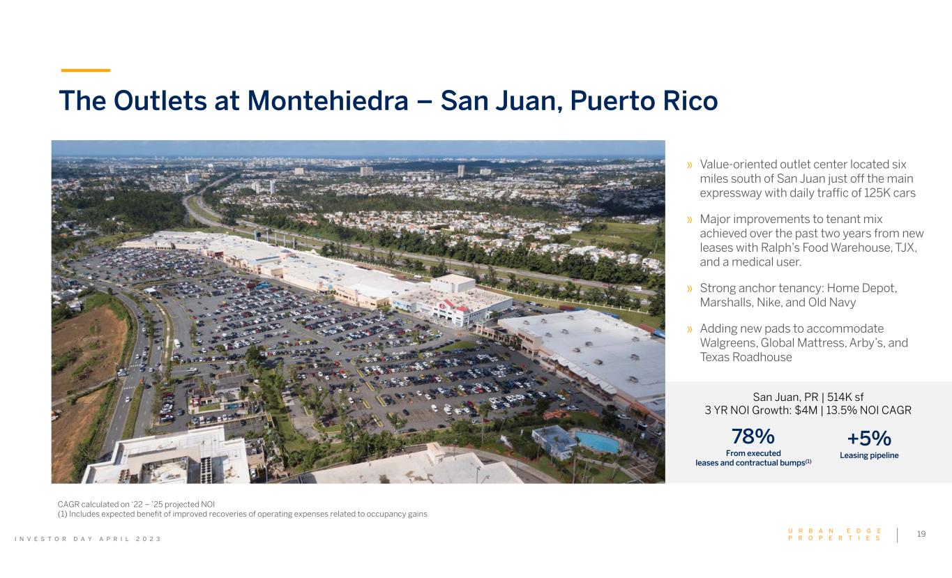 I N V E S T O R D A Y A P R I L 2 0 2 3 U R B A N E D G E P R O P E R T I E S 18 The Sun is Shining in Puerto Rico » Significant relocation and tourism combined with tax incentives are helping drive local economic growth particularly in high density areas » Record low unemployment has enabled the local consumer to remain resilient » National and regional retailers, including Ross, TJX, and Burlington, are expanding on the island » Retail vacancy is at a 10-year low(1) » We expect to double the NOI generated in Puerto Rico over five years CAGR calculated on ‘22 – ’25 projected NOI Total Puerto Rico 3-YR NOI Growth: $8M | 13% NOI CAGR 70% From executed leases and contractual bumps (2) +10% Leasing pipeline (1) Per JLL Market Update 3/23 (2) Includes expected benefit of improved recoveries of operating expenses related to occupancy gains $13 $19 $18 $19 $23 $26 $- $5 $10 $15 $20 $25 $30 2020 2021 2022 2023P 2024P 2025P NOI (M) Montehiedra 3-YR NOI Growth: $4M | 13.5% NOI CAGR 78% From executed leases and contractual bumps(2) +5% Leasing pipeline Las Catalinas 3-YR NOI Growth: $4M | 12.5% NOI CAGR 65% From executed leases and contractual bumps (2) +10% Leasing pipeline + =