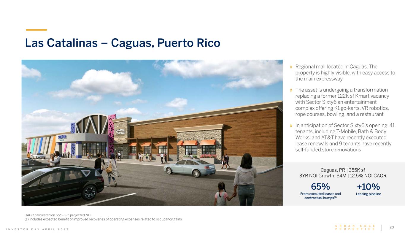 I N V E S T O R D A Y A P R I L 2 0 2 3 U R B A N E D G E P R O P E R T I E S 19 The Outlets at Montehiedra – San Juan, Puerto Rico » Value-oriented outlet center located six miles south of San Juan just off the main expressway with daily traffic of 125K cars » Major improvements to tenant mix achieved over the past two years from new leases with Ralph’s Food Warehouse, TJX, and a medical user. » Strong anchor tenancy: Home Depot, Marshalls, Nike, and Old Navy » Adding new pads to accommodate Walgreens, Global Mattress, Arby’s, and Texas Roadhouse San Juan, PR | 514K sf 3 YR NOI Growth: $4M | 13.5% NOI CAGR 78% From executed leases and contractual bumps(1) +5% Leasing pipeline CAGR calculated on ‘22 – ’25 projected NOI (1) Includes expected benefit of improved recoveries of operating expenses related to occupancy gains