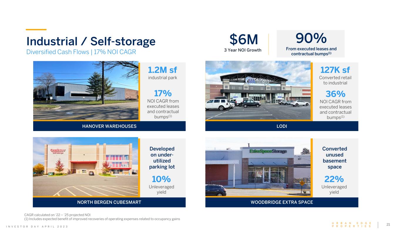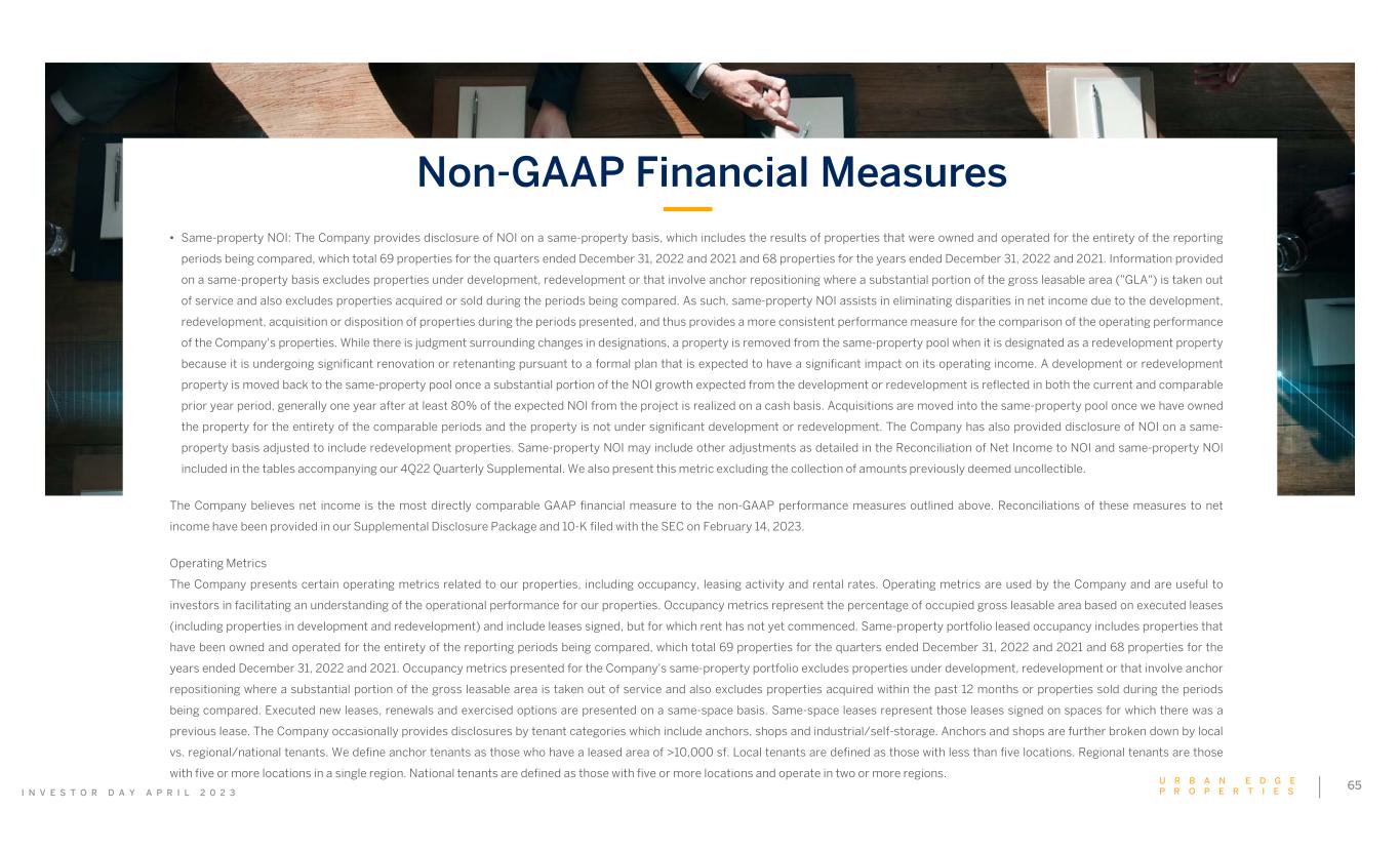 I N V E S T O R D A Y A P R I L 2 0 2 3 U R B A N E D G E P R O P E R T I E S 65 • Same-property NOI: The Company provides disclosure of NOI on a same-property basis, which includes the results of properties that were owned and operated for the entirety of the reporting periods being compared, which total 69 properties for the quarters ended December 31, 2022 and 2021 and 68 properties for the years ended December 31, 2022 and 2021. Information provided on a same-property basis excludes properties under development, redevelopment or that involve anchor repositioning where a substantial portion of the gross leasable area ("GLA") is taken out of service and also excludes properties acquired or sold during the periods being compared. As such, same-property NOI assists in eliminating disparities in net income due to the development, redevelopment, acquisition or disposition of properties during the periods presented, and thus provides a more consistent performance measure for the comparison of the operating performance of the Company's properties. While there is judgment surrounding changes in designations, a property is removed from the same-property pool when it is designated as a redevelopment property because it is undergoing significant renovation or retenanting pursuant to a formal plan that is expected to have a significant impact on its operating income. A development or redevelopment property is moved back to the same-property pool once a substantial portion of the NOI growth expected from the development or redevelopment is reflected in both the current and comparable prior year period, generally one year after at least 80% of the expected NOI from the project is realized on a cash basis. Acquisitions are moved into the same-property pool once we have owned the property for the entirety of the comparable periods and the property is not under significant development or redevelopment. The Company has also provided disclosure of NOI on a same- property basis adjusted to include redevelopment properties. Same-property NOI may include other adjustments as detailed in the Reconciliation of Net Income to NOI and same-property NOI included in the tables accompanying our 4Q22 Quarterly Supplemental. We also present this metric excluding the collection of amounts previously deemed uncollectible. The Company believes net income is the most directly comparable GAAP financial measure to the non-GAAP performance measures outlined above. Reconciliations of these measures to net income have been provided in our Supplemental Disclosure Package and 10-K filed with the SEC on February 14, 2023. Operating Metrics The Company presents certain operating metrics related to our properties, including occupancy, leasing activity and rental rates. Operating metrics are used by the Company and are useful to investors in facilitating an understanding of the operational performance for our properties. Occupancy metrics represent the percentage of occupied gross leasable area based on executed leases (including properties in development and redevelopment) and include leases signed, but for which rent has not yet commenced. Same-property portfolio leased occupancy includes properties that have been owned and operated for the entirety of the reporting periods being compared, which total 69 properties for the quarters ended December 31, 2022 and 2021 and 68 properties for the years ended December 31, 2022 and 2021. Occupancy metrics presented for the Company's same-property portfolio excludes properties under development, redevelopment or that involve anchor repositioning where a substantial portion of the gross leasable area is taken out of service and also excludes properties acquired within the past 12 months or properties sold during the periods being compared. Executed new leases, renewals and exercised options are presented on a same-space basis. Same-space leases represent those leases signed on spaces for which there was a previous lease. The Company occasionally provides disclosures by tenant categories which include anchors, shops and industrial/self-storage. Anchors and shops are further broken down by local vs. regional/national tenants. We define anchor tenants as those who have a leased area of >10,000 sf. Local tenants are defined as those with less than five locations. Regional tenants are those with five or more locations in a single region. National tenants are defined as those with five or more locations and operate in two or more regions. Non-GAAP Financial Measures