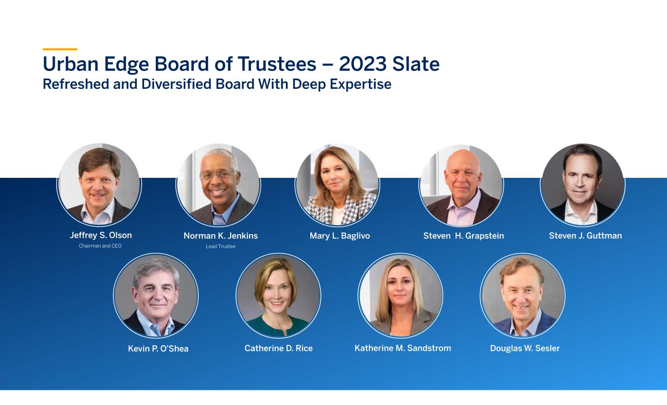 Urban Edge Board of Trustees – 2023 Slate Refreshed and Diversified Board With Deep Expertise Katherine M. SandstromKevin P. O’Shea Mary L. Baglivo Steven H. Grapstein Steven J. GuttmanNorman K. Jenkins Lead Trustee Jeffrey S. Olson Chairman and CEO Douglas W. SeslerCatherine D. Rice