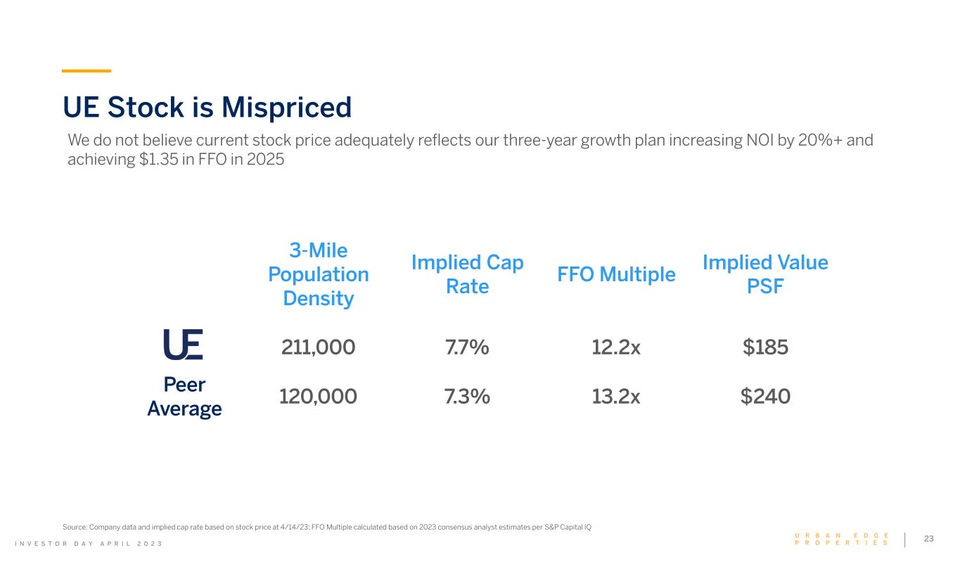 I N V E S T O R P R E S E N T A T I O N 23I N V E S T O R D A Y A P R I L 2 0 2 3 U R B A N E D G E P R O P E R T I E S Implied Value PSF FFO Multiple Implied Cap Rate 3-Mile Population Density $18512.2x7.7%211,000 $24013.2x7.3%120,000 Peer Average UE Stock is Mispriced We do not believe current stock price adequately reflects our three-year growth plan increasing NOI by 20%+ and achieving $1.35 in FFO in 2025 Source: Company data and implied cap rate based on stock price at 4/14/23; FFO Multiple calculated based on 2023 consensus analyst estimates per S&P Capital IQ