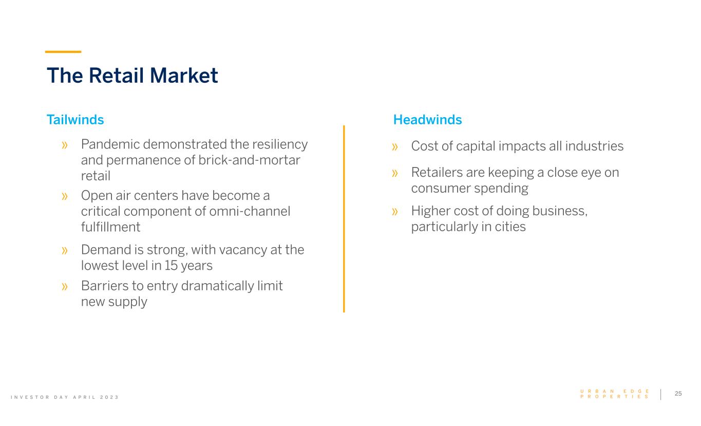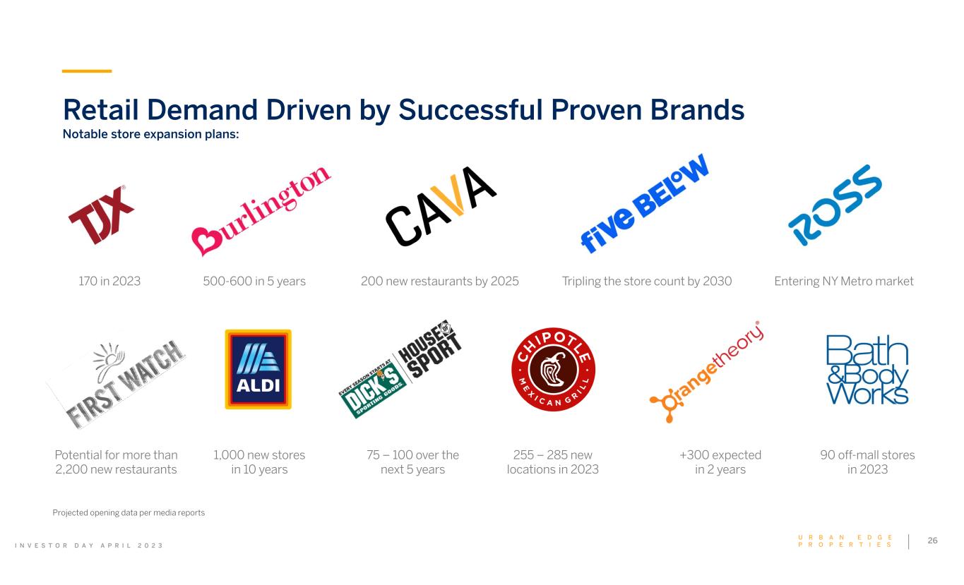 I N V E S T O R D A Y A P R I L 2 0 2 3 U R B A N E D G E P R O P E R T I E S 25 The Retail Market Tailwinds » Pandemic demonstrated the resiliency and permanence of brick-and-mortar retail » Cost of capital impacts all industries Headwinds » Demand is strong, with vacancy at the lowest level in 15 years » Barriers to entry dramatically limit new supply » Open air centers have become a critical component of omni-channel fulfillment » Retailers are keeping a close eye on consumer spending » Higher cost of doing business, particularly in cities