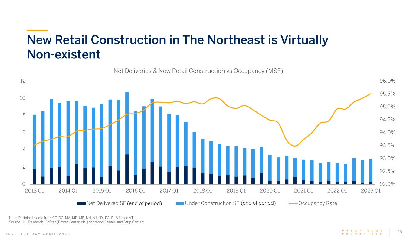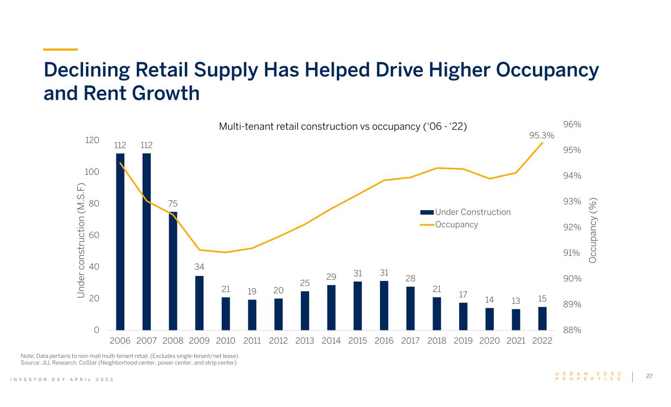 I N V E S T O R D A Y A P R I L 2 0 2 3 U R B A N E D G E P R O P E R T I E S 27 Declining Retail Supply Has Helped Drive Higher Occupancy and Rent Growth 112 112 75 34 21 19 20 25 29 31 31 28 21 17 14 13 15 95.3% 88% 89% 90% 91% 92% 93% 94% 95% 96% 0 20 40 60 80 100 120 2006 2007 2008 2009 2010 2011 2012 2013 2014 2015 2016 2017 2018 2019 2020 2021 2022 O cc up an cy ( % ) U n d er c on st ru ct io n ( M .S .F ) Multi-tenant retail construction vs occupancy (‘06 - ‘22) Under Construction Occupancy Note: Data pertains to non-mall multi-tenant retail. (Excludes single-tenant/net lease) Source: JLL Research, CoStar (Neighborhood center, power center, and strip center)